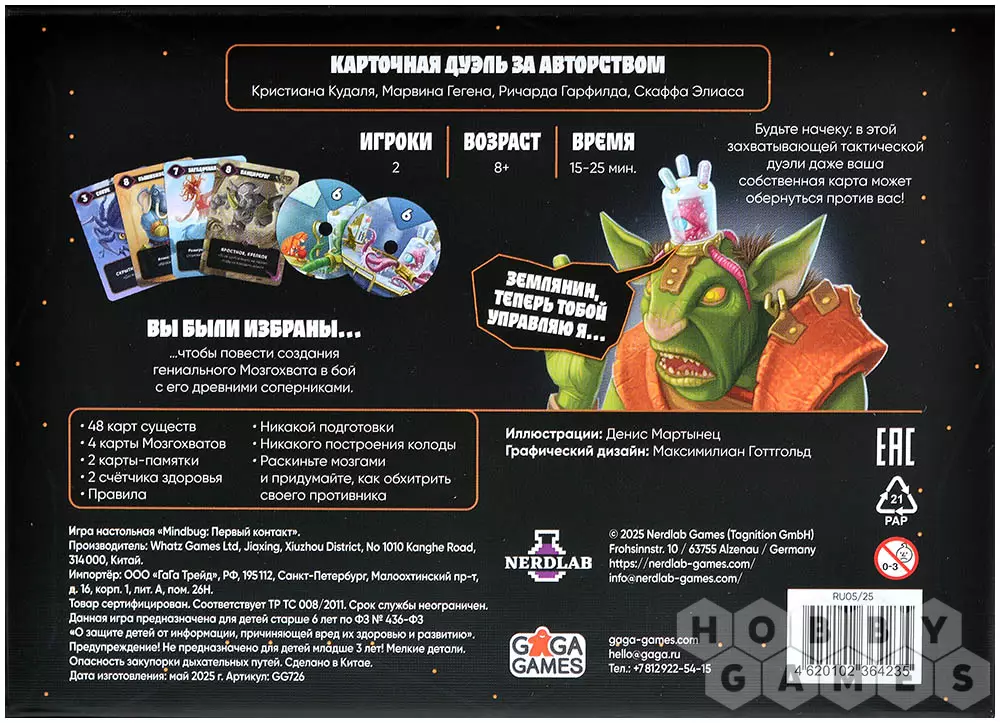 Встречайте "Mindbug: Первый Контакт" – тактическую дуэль, где самый опасный враг может стать вашим оружием. Вызывайте на поле боя причудливых существ-гибридов, чтобы атаковать оппонента. Но будьте осторожны: когда вы разыгрываете свою самую грозную карту, противник может применить одного из двух своих Мозгохватов, чтобы мгновенно перехватить над ней контроль. Удастся ли вам переиграть соперника или ваша же мощь обернётся против вас?