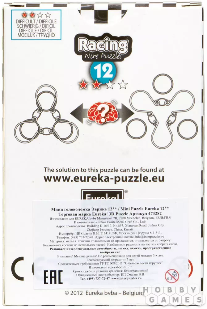 Эта небольшая металлическая головоломка – часть линейки Racing Wire Puzzles от компании Eurika. Головоломки из этой линейки, как можно понять из названия, предназначены для быстрого решения. Их можно использовать как для дружеского соревнования, так и просто приятного времяпрепровождения. Уровень сложности указывается на коробке с помощью звёздочек: одна для головоломок, предназначенных для начинающих, такие будут интересны, например, школьнику, две – для энтузиастов, три для сильно увлечённых, а четыре – для экспертов по головоломкам.