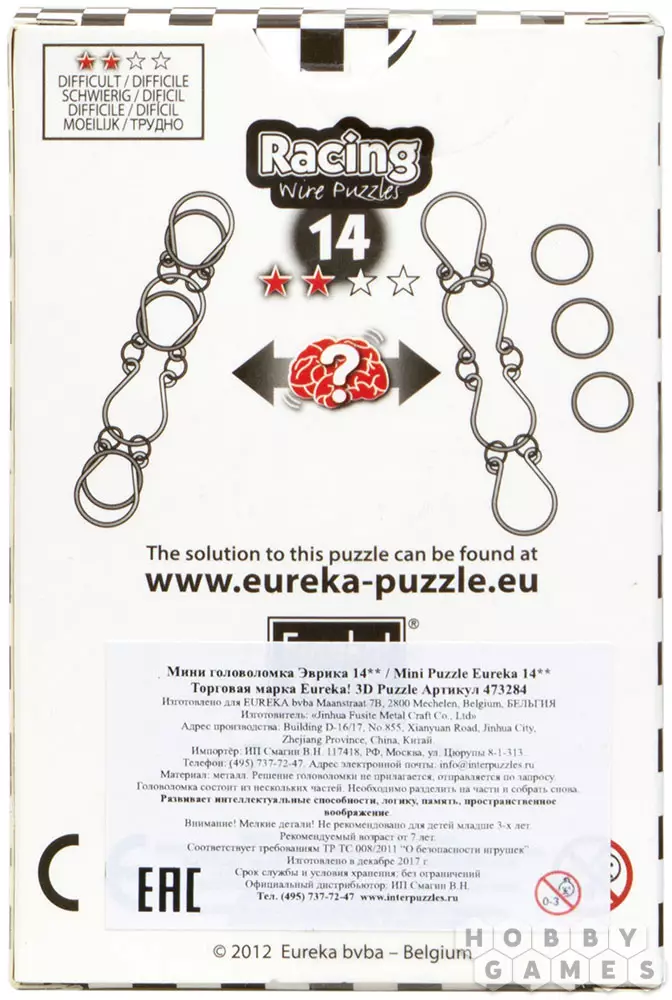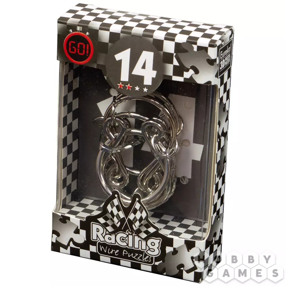Эта небольшая металлическая головоломка – часть линейки Racing Wire Puzzles от компании Eurika. Головоломки из этой линейки, как можно понять из названия, предназначены для быстрого решения. Их можно использовать как для дружеского соревнования, так и просто приятного времяпрепровождения. Уровень сложности указывается на коробке с помощью звёздочек: одна для головоломок, предназначенных для начинающих, такие будут интересны, например, школьнику, две – для энтузиастов, три для сильно увлечённых, а четыре – для экспертов по головоломкам.