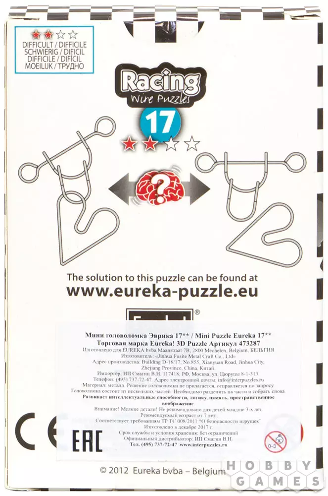 Эта небольшая металлическая головоломка – часть линейки Racing Wire Puzzles от компании Eurika. Головоломки из этой линейки, как можно понять из названия, предназначены для быстрого решения. Их можно использовать как для дружеского соревнования, так и просто приятного времяпрепровождения. Уровень сложности указывается на коробке с помощью звёздочек: одна для головоломок, предназначенных для начинающих, такие будут интересны, например, школьнику, две – для энтузиастов, три для сильно увлечённых, а четыре – для экспертов по головоломкам.