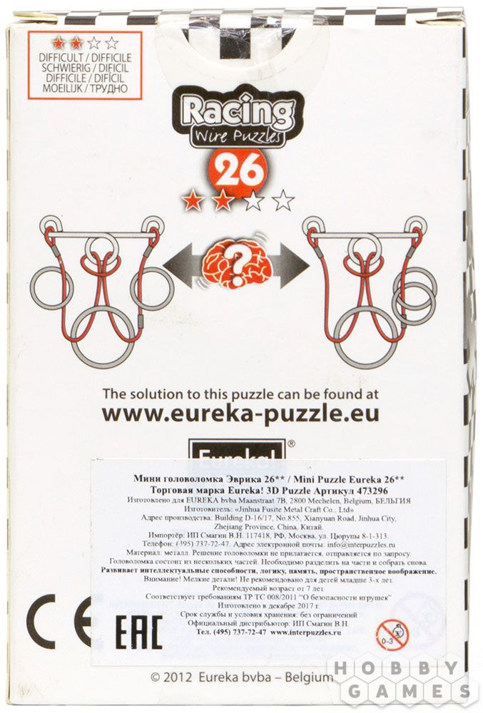 Эта небольшая металлическая головоломка – часть линейки Racing Wire Puzzles от компании Eurika. Головоломки из этой линейки, как можно понять из названия, предназначены для быстрого решения. Их можно использовать как для дружеского соревнования, так и просто приятного времяпрепровождения. Уровень сложности указывается на коробке с помощью звёздочек: одна для головоломок, предназначенных для начинающих, такие будут интересны, например, школьнику, две – для энтузиастов, три для сильно увлечённых, а четыре – для экспертов по головоломкам.
