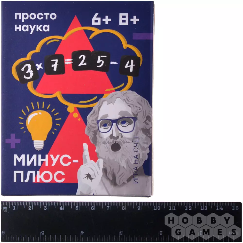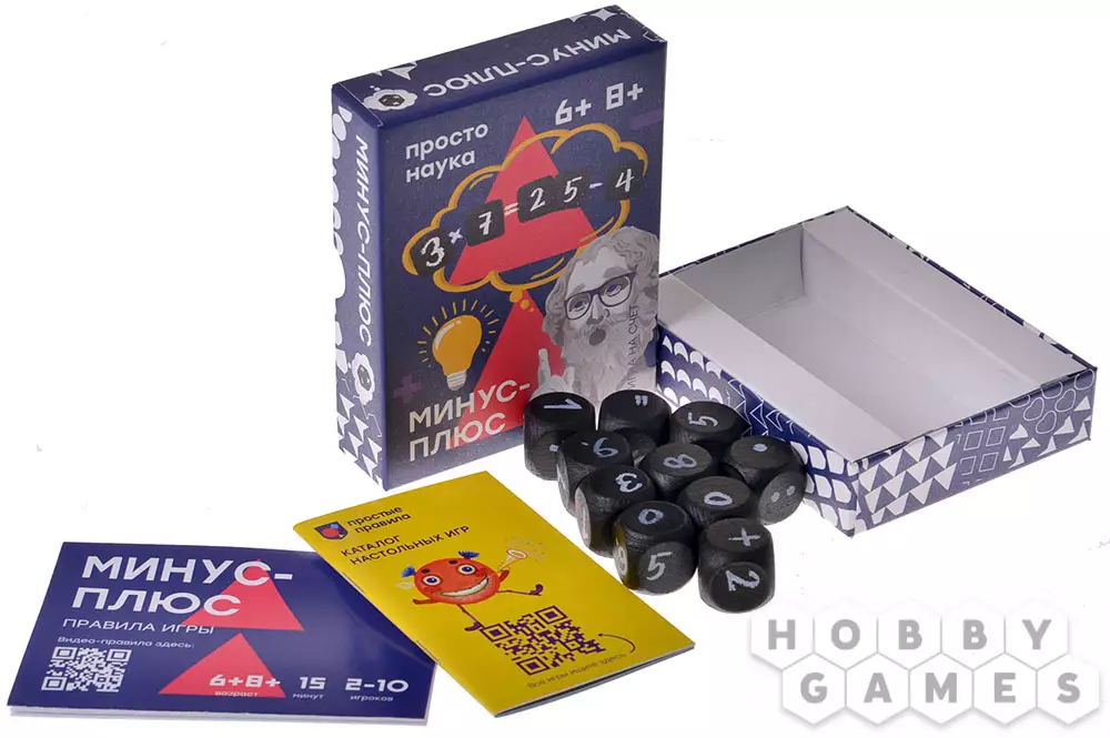 Игра "Минус-плюс" преподносит арифметику начальной школы в необычном игровом формате! В начале раунда бросаются девять кубиков, содержащих цифры и знаки арифметических действий. Далее все игроки одновременно стараются придумать равенство из цифр и знаков, выпавших на кубиках. Игрок, что быстрее всех находит пример, объявляет об этом и выстраивает его при помощи кубиков. Чем больше кубиков игроков задействовал в составлении примера, тем больше получит очков (разумеется, при условии, что равенство оказалось верным!). Следом начинается новый раунд по тем же правилам. Игра будет идти до тех пор, пока кто-то из юных математиков не наберёт 20 очков!