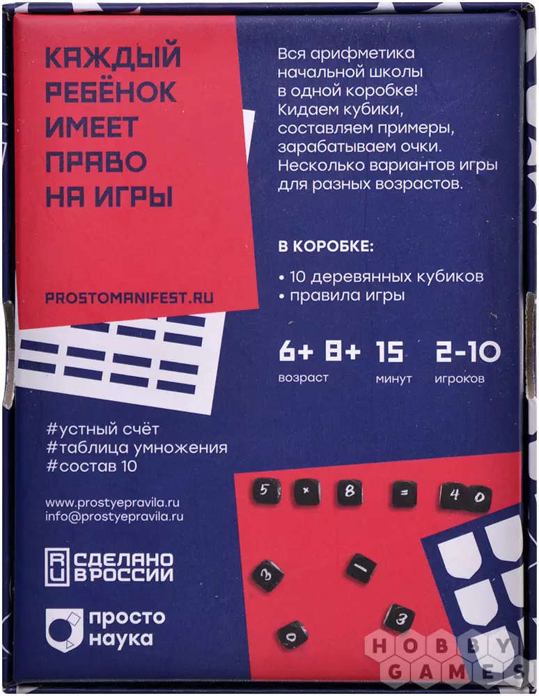 Игра поможет изучить арифметику и научиться быстро считать в захватывающей форме. Также в правила включены дополнительные варианты игры: упрощённый, в котором не участвуют знаки умножения и деления, и два усложнённых.