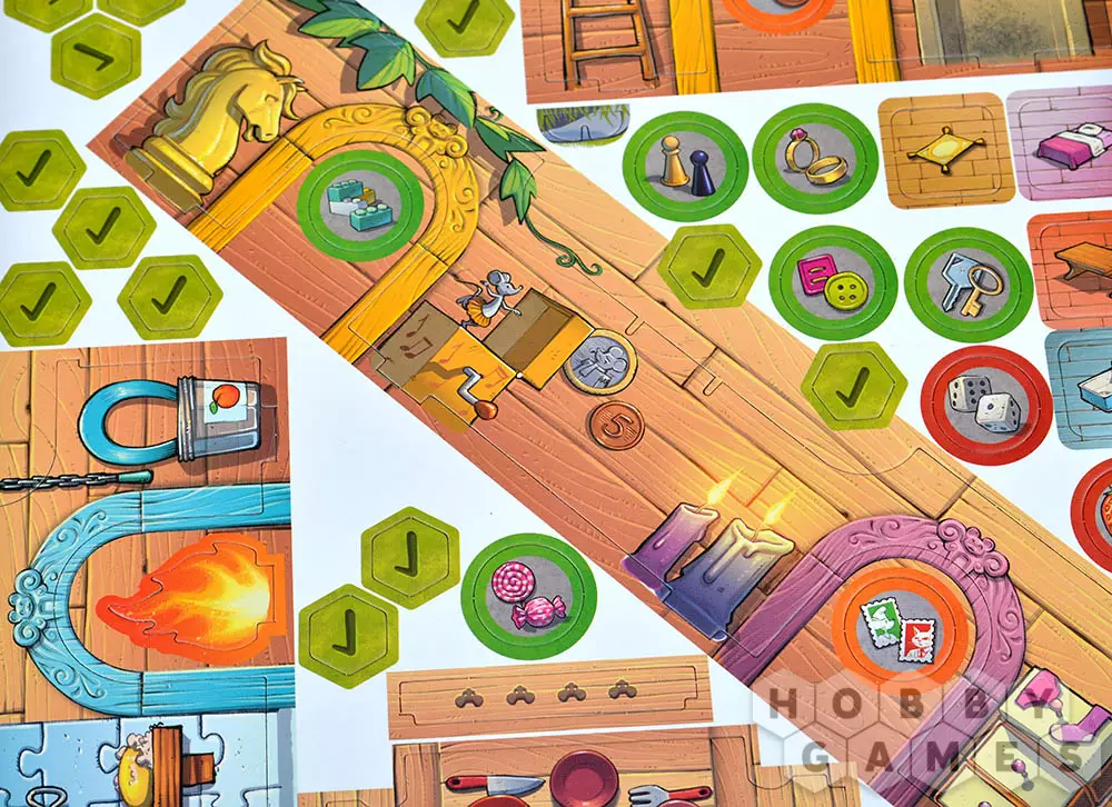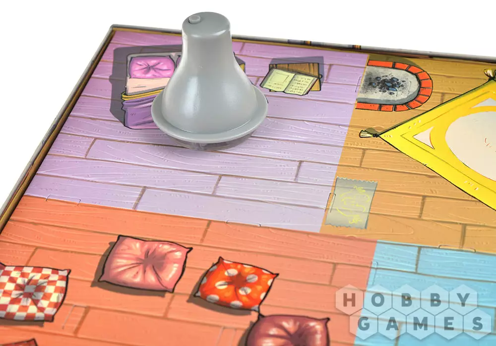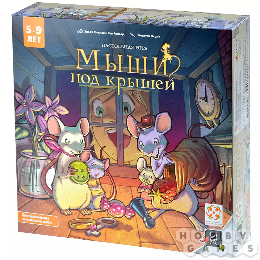 "Мыши под крышей" – это весёлая кооперативная игра на внимание и память для детей в возрасте от 5 до 9 лет. Она завораживает и привлекает к себе внимание уже на этапе подготовки: игровое поле представляет собой настоящий трёхмерный домик с небольшими окошками и четырьмя разными комнатами внутри. Игроки будут освещать домик фонариком (входит в комплект) через крышу, чтобы символы внутри комнат стали видны. А затем у них будет 30 секунд на то, чтобы рассмотреть домик в окошки и запомнить, какой предмет в какой комнате находится. После этого на специальный лист вопроса попарно помещаются жетоны предметов и комнат. Например, жетон с нитками лежит рядом с жетоном спальни, игроки должны ответить, был ли этот предмет в спальне на самом деле или нет. Чем больше правильных ответов дадут юные игроки, тем больше победных очков они получат.