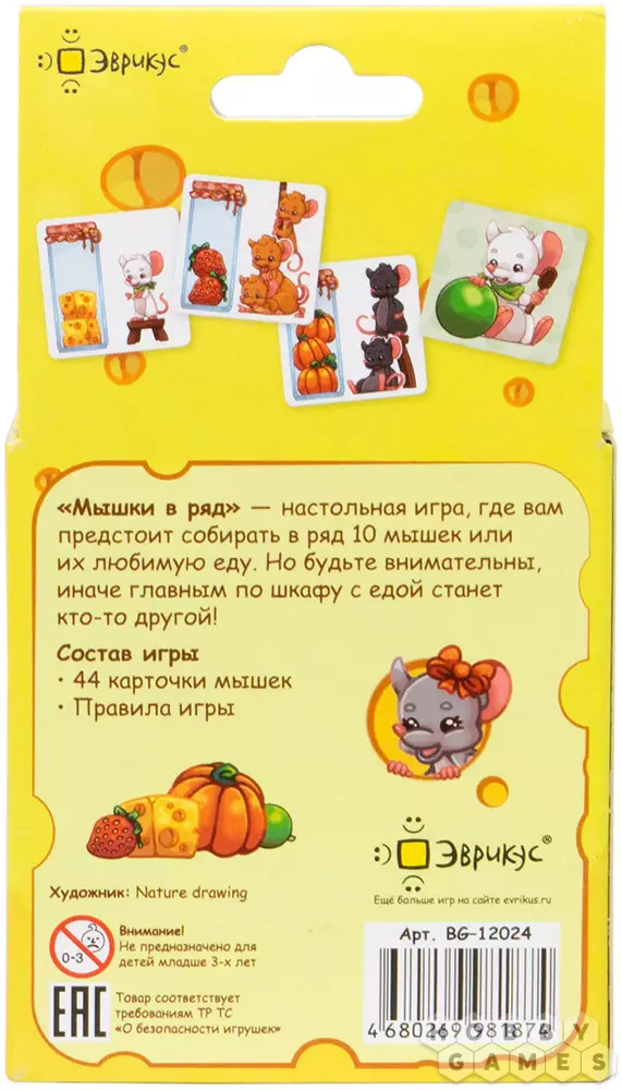 "Мышки в ряд" – это очень простая настольная игра, которая идеально подойдёт для детей дошкольного возраста. Быстрые партии и компактный размер позволяют брать игру в дорогу, а милые иллюстрации понравятся не только малышам, но и их родителям.