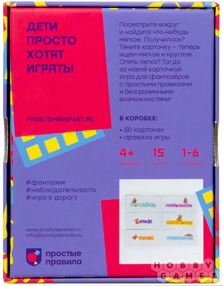 В специальном мешочке лежат 50 карточек, на которых написаны различные прилагательные. Каждое из них передано так, что оно похоже на то, что обозначает. Например, прилагательное "деревянное" выполнено из дерева, "мокрое" выглядит так, как будто карточка промокла, а "клетчатое" иллюстрировано клетчатыми буквами. Правила игры можно варьировать.