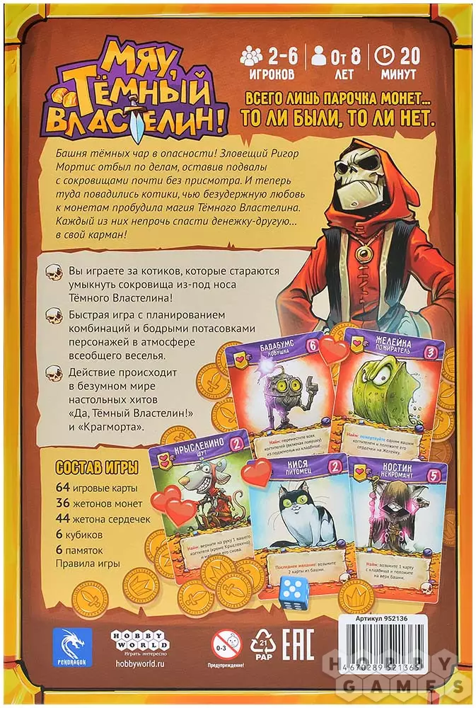 "Мяу, Тёмный Властелин!" – это весёлая настольная игра для компании, где каждый игрок становится хвостатым воришкой в башне злодея. Действие игры происходит в мире любимых многими хитов "Крагморта" и "Да, Тёмный Властелин", так что если вы уже являетесь счастливым обладателем одной из этих коробочек (а может быть, сразу двух?), вы наверняка будете рады исследовать вселенную и дальше, теперь в роли амбициозных котиков! Вам предстоит с помощью красочных карт собирать различные комбинации и сталкиваться с соперниками лицом к лицу в динамичных стычках, где можно как вырваться вперёд, так и остаться ни с чем. Только не забывайте следить за обстановкой вокруг, ведь добыча добычей, но ещё важнее – вовремя не сбежать! Быстро, смешно, хаотично – идеальный выбор для весёлого вечера в кругу друзей.