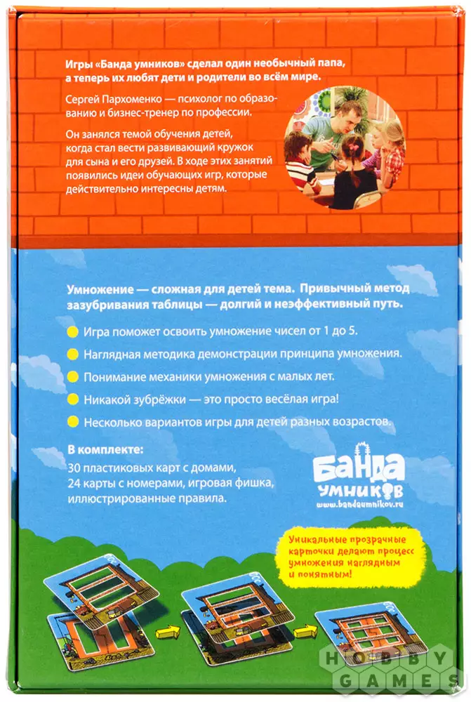 Яркая и весёлая игра, построенная на уникальной методике изучения умножения. Соединяя карточки с домами и окнами, ребенок учится умножению в красочном и увлекательном игровом процессе. В правилах также присутствуют альтернативные варианты игры.