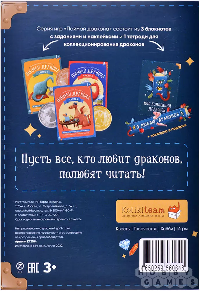 "Моя коллекция драконов" – это тетрадь, которая пригодится юным искателям. Она относится к серии квестов "Поймай дракона" и создана для хранения наклеек драконов, которых дети смогли отыскать в ходе решения квестов. В комплекте с тетрадью идёт закладка, которая поможет быстро открыть нужную страницу.