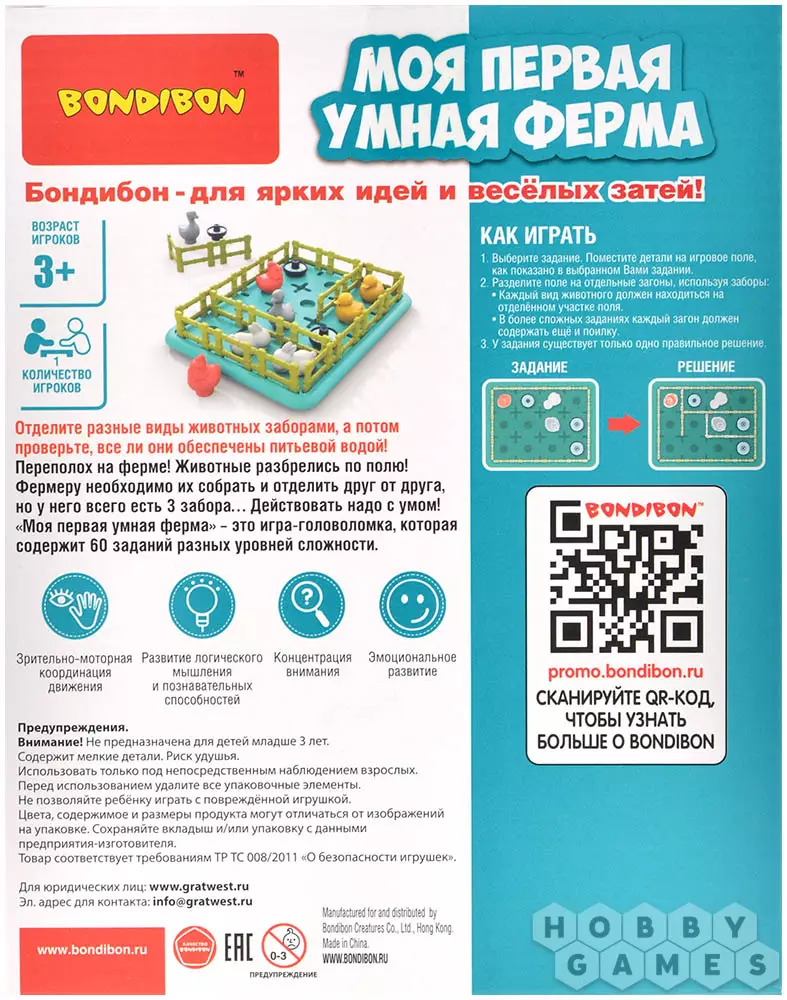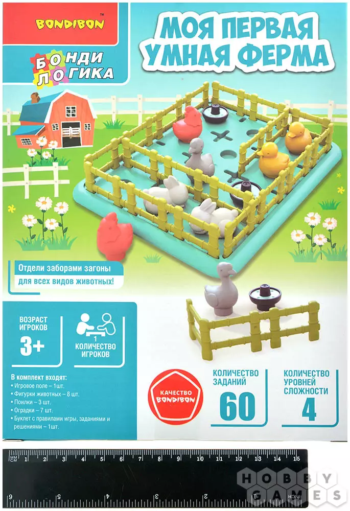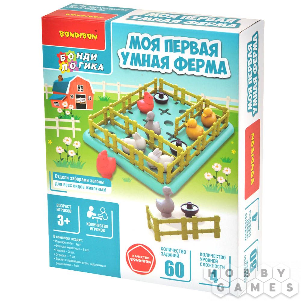"Моя первая умная ферма" – это увлекательная головоломка для самых маленьких игроков, которая в увлекательной и непринуждённой форме помогает развивать мелкую моторику, логическое мышление, а также концентрацию внимания. Выберите одно из шестидесяти заданий и разместите на поле фигурки животных так, как указано в этом задании. А теперь, используя детали забора разных форм, постарайтесь собрать одинаковых животных вместе в одном загоне. При этом обязательно постарайтесь, чтобы каждый загон был обеспечен водой! Каждое задание имеет только одно решение, в котором должны быть задействованы все элементы.