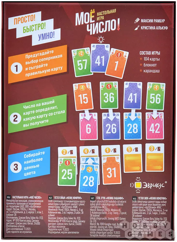 Ваша задача – максимизировать свой выигрыш, подбирая карты и предугадывая ходы соперников. В "Моё число!" успех определяет интуиция и аналитические способности!
