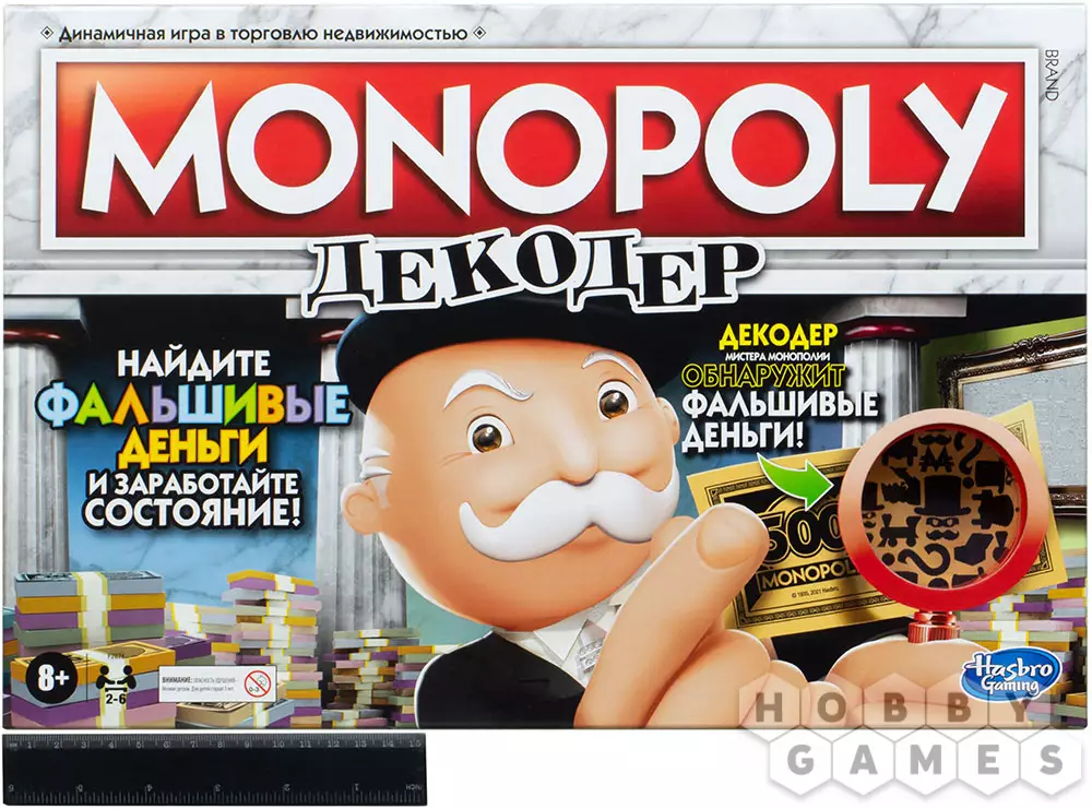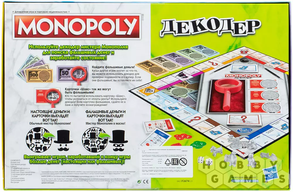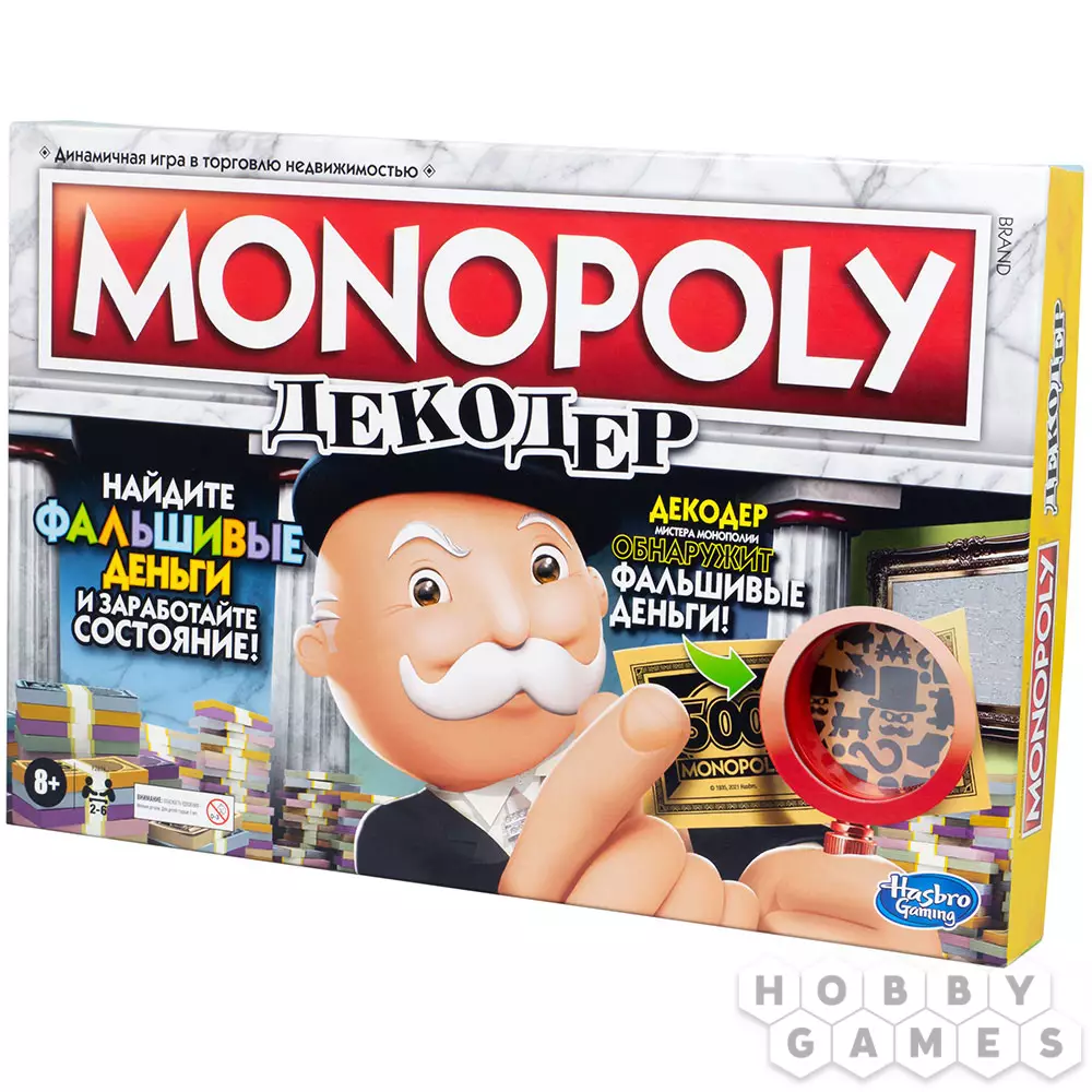 Ещё одна часть популярной серии настольных игр "Монополия: Декодер" привносит очередную "изюминку" во всеми знакомый, классический игровой процесс: совершать сделки придётся с куда большей осторожностью, чем раньше, ведь за вашу собственность могут заплатить фальшивыми деньгами, а также могут попасться фальшивые карточки "Шанс". Но не стоит волноваться, инструмент под названием декодер поможет вам обнаружить подделки!