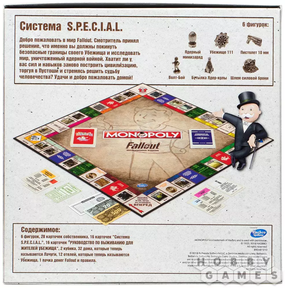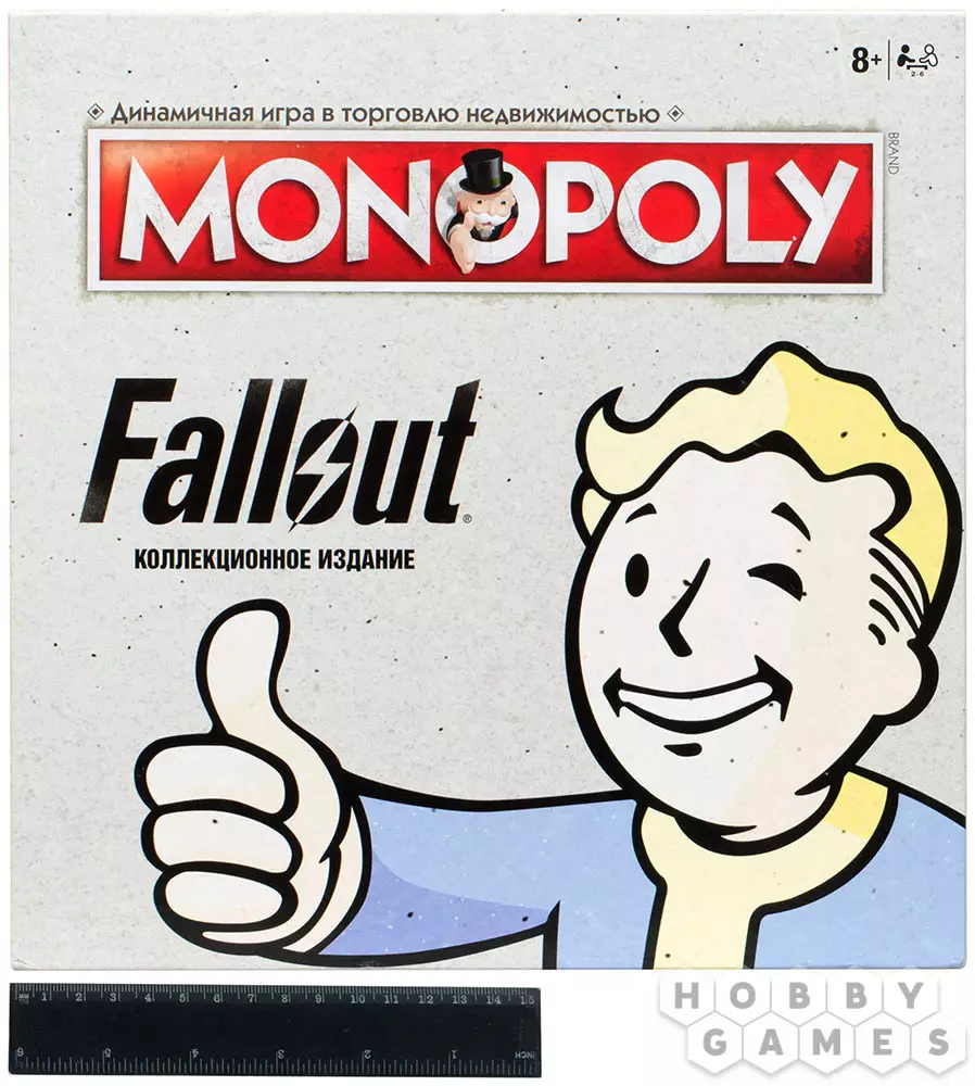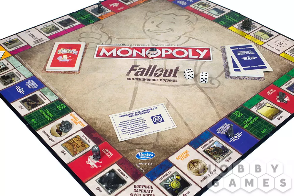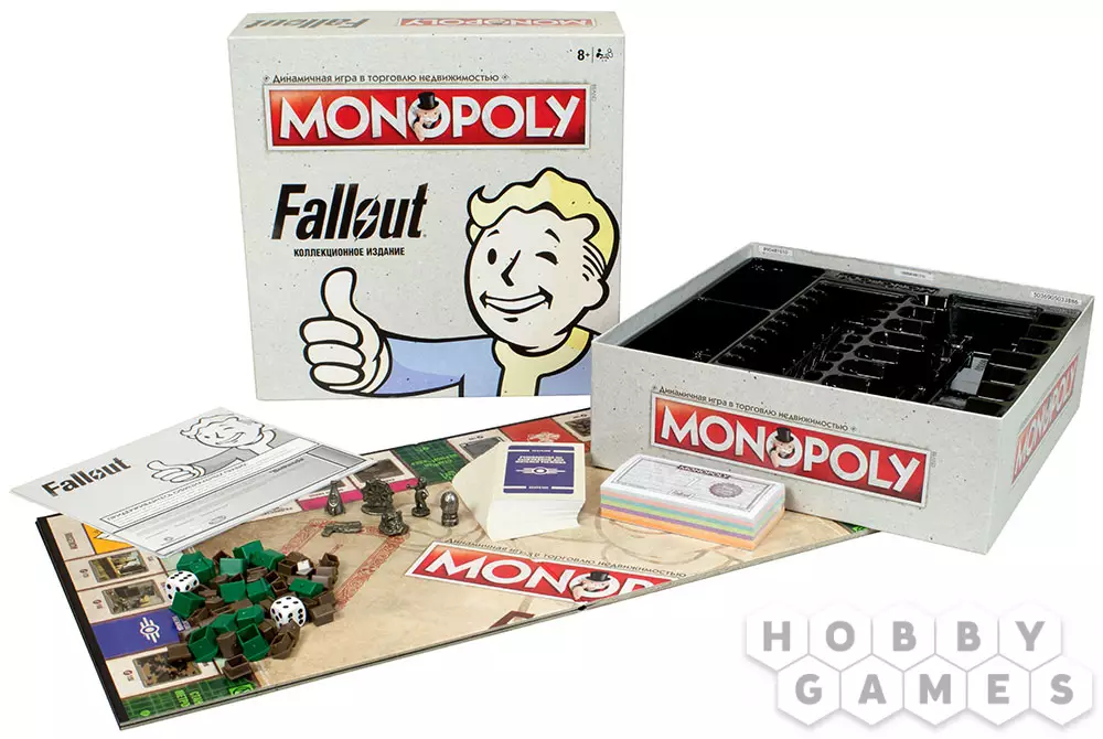 "Монополия. Fallout" – это свежая версия великолепной экономической стратегии для всей семьи. В качестве сеттинга был выбран постапокалиптический мир Fallout – культовой серии ролевых видеоигр, действие которой разворачивается недалёком будущем после мировой ядерной войны. Эта игра доказывает, что экономика существует всегда, даже на фоне конца света и полного упадка человечества!