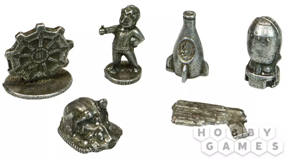 Игровые фишки выполнены в стиле атомпанк и являются символами вселенной: 10-мм пистолет, Волт-Бой, Убежище 111, Шлем от силовой брони, Ядерный минизаряд и бутылка Ядер-колы