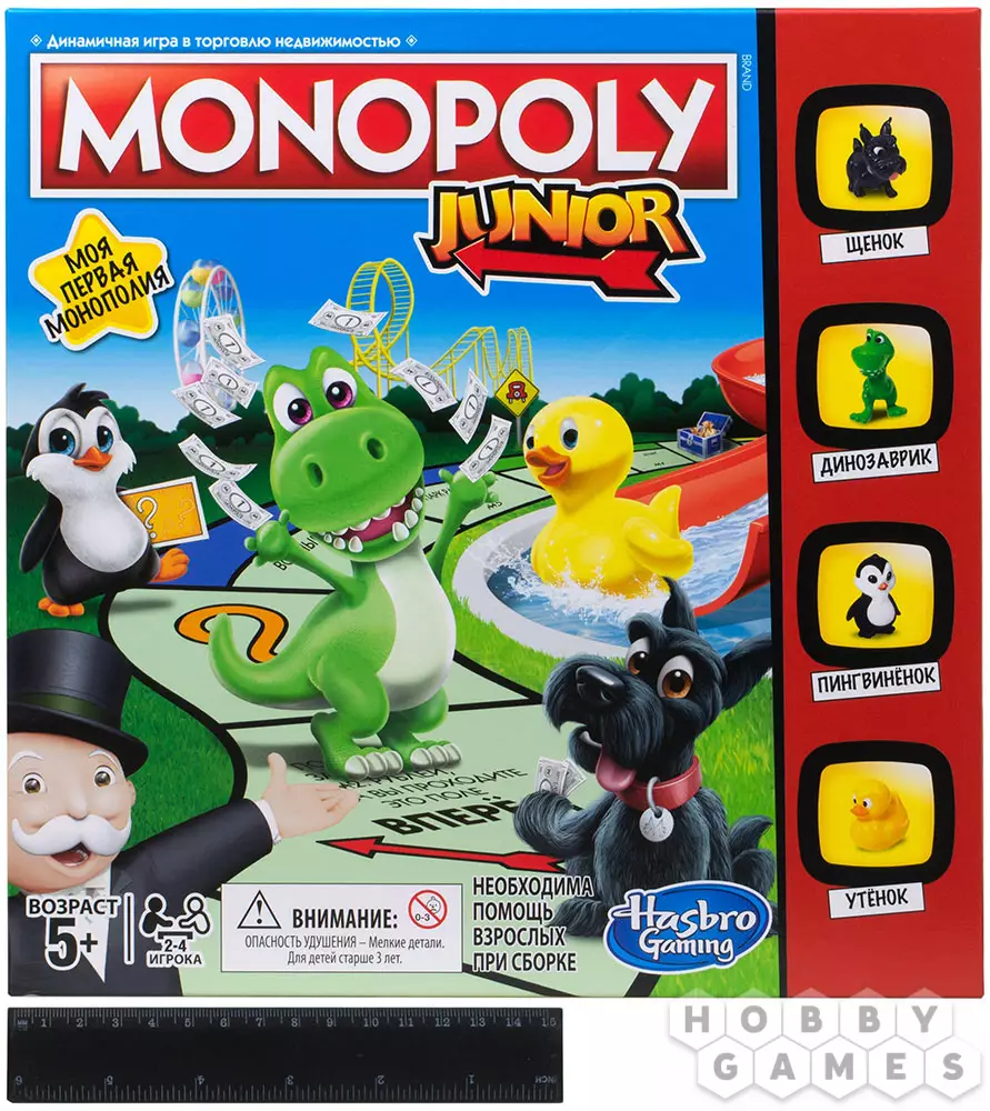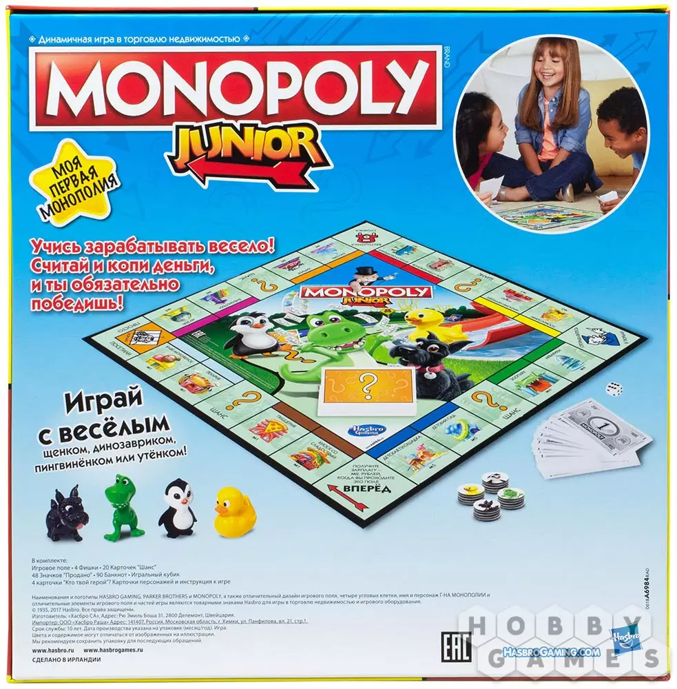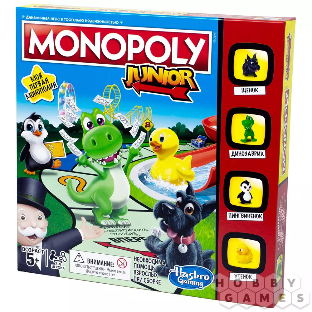 "Монополия Junior" – новая версия легендарной экономической игры, адаптированная для детей. Также она известна под слоганом "Моя первая Монополия". Благодаря этой вариации популярной настолки дети получат возможность научиться считать и копить деньги. В весёлой и непринуждённой манере они очень быстро научатся зарабатывать игровые деньги и непременно побеждать!