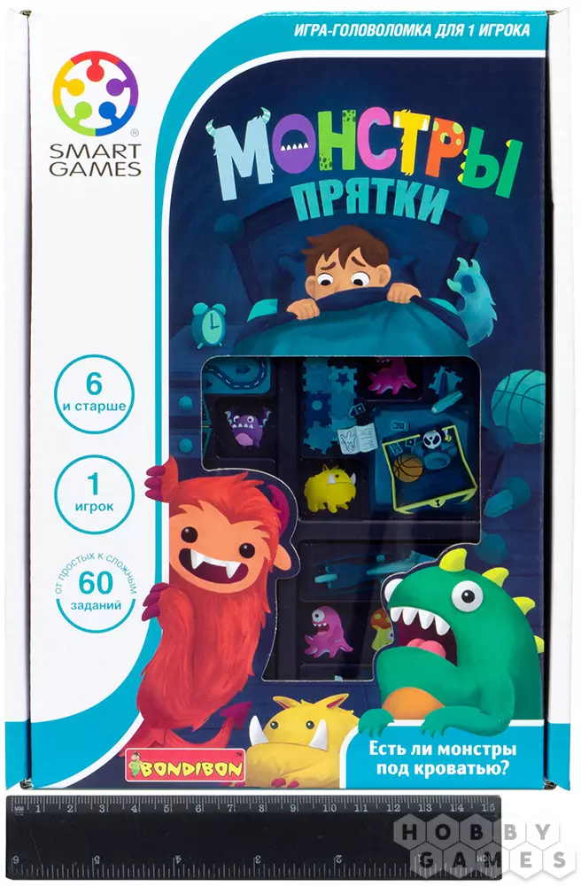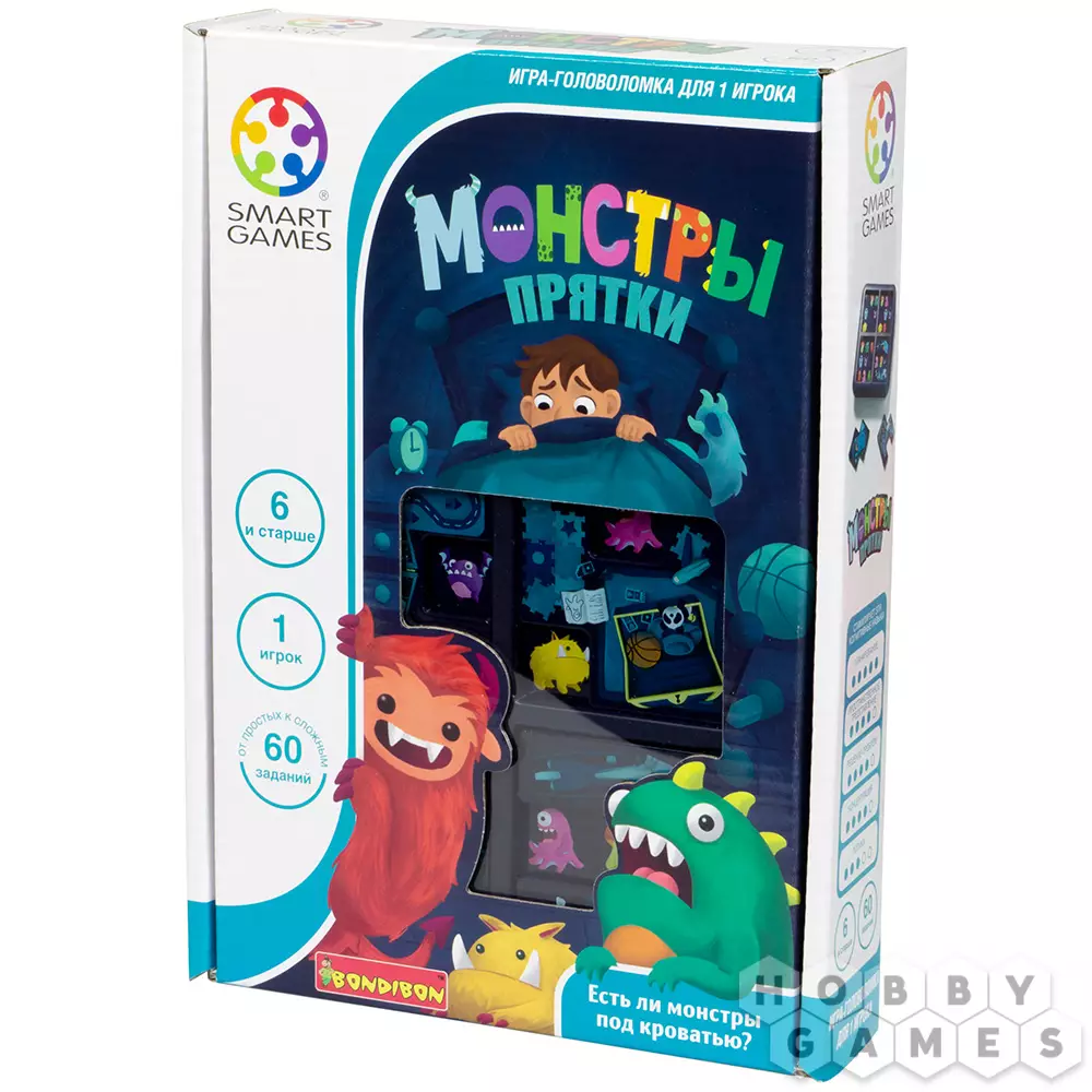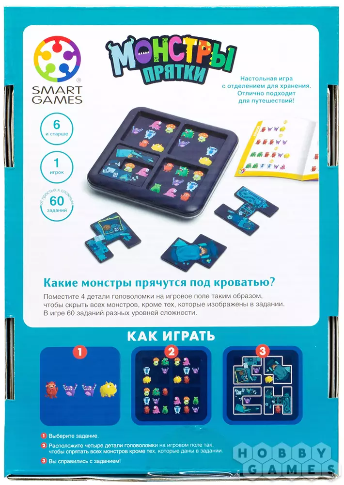 Вы всё ещё не верите в монстров под кроватью? Да их там целое множество! Увлекательная игра "Монстры прятки" от Бондибон покажет вам мир забавных монстров-страшилок и научит их прятать на игровом поле так, чтобы их невозможно было найти. Во время игры вы не только поднимете настроение, но и прокачаете интеллект, логику и пространственное мышление. И всё это происходит в настоящей реальности, где необходима дружная работа рук и головы! И никаких гаджетов! Ведь в этом и заключается более здоровый метод практики сосредоточенности и концентрации. Вам необходимо поместить 4 детали головоломки на игровом поле так, чтобы они были скрыты от всех монстров, кроме тех, которые показаны в задании. В игре вы найдёте 60 заданий самой разной сложности.