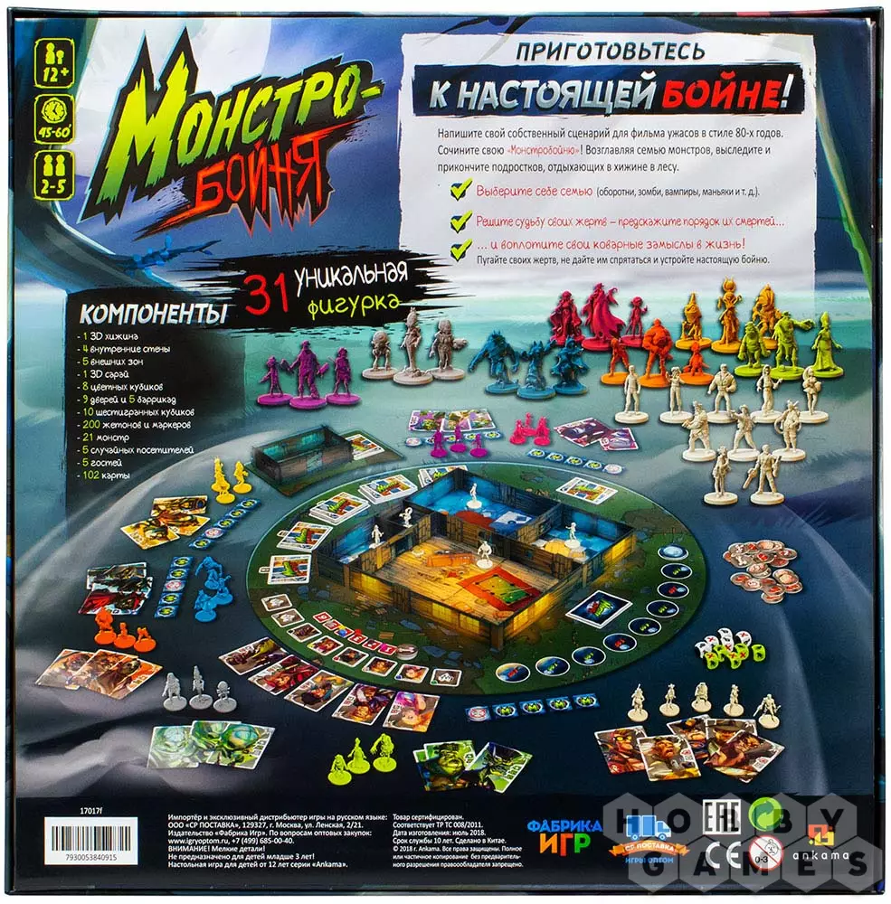 "Монстробойня" – настольная игра, погружающая в атмосферу видеоужастиков восьмидесятых годов, таких, где группа людей случайно попадают в старую заброшенную хижину в тёмном глухом лесу. Ну, и как нетрудно догадаться, всякая нечисть так и тянется к этому домику, на дух человечий, чтобы полакомиться свежим мясом!