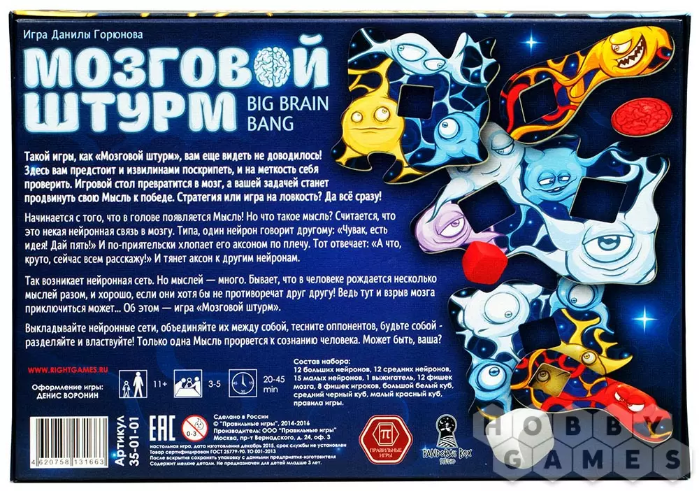 Настольная игра "Мозговой штурм" – самобытная интерпретация классических игр на меткость, наподобие знаменитой игры "Чапаев". Конечно же, она не переносит реальные процессы мозга на стол, но удовольствия и веселья доставит немало!
