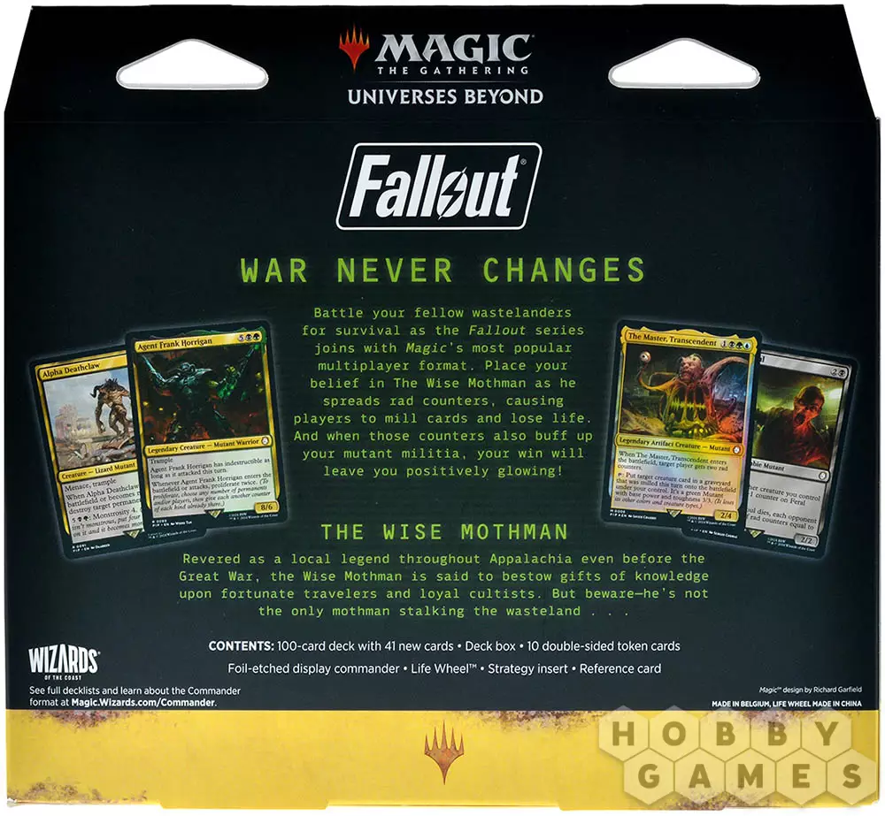 Оживите процесс ядерного распада, погрузившись в мир с самыми передовыми разработками и легендарными героями из вселенной Fallout, начиная с 1997 года! В этом выпуске Magic: The Gathering вас ждут угрозы из Пустоши: Супермутанты, Криптиды, Рейдеры и множество других опасностей, которые были тщательно протестированы в радиоактивных песках и получили одобрение Vault-Tec.