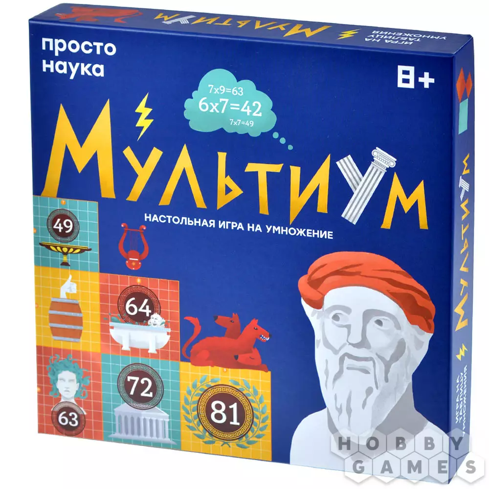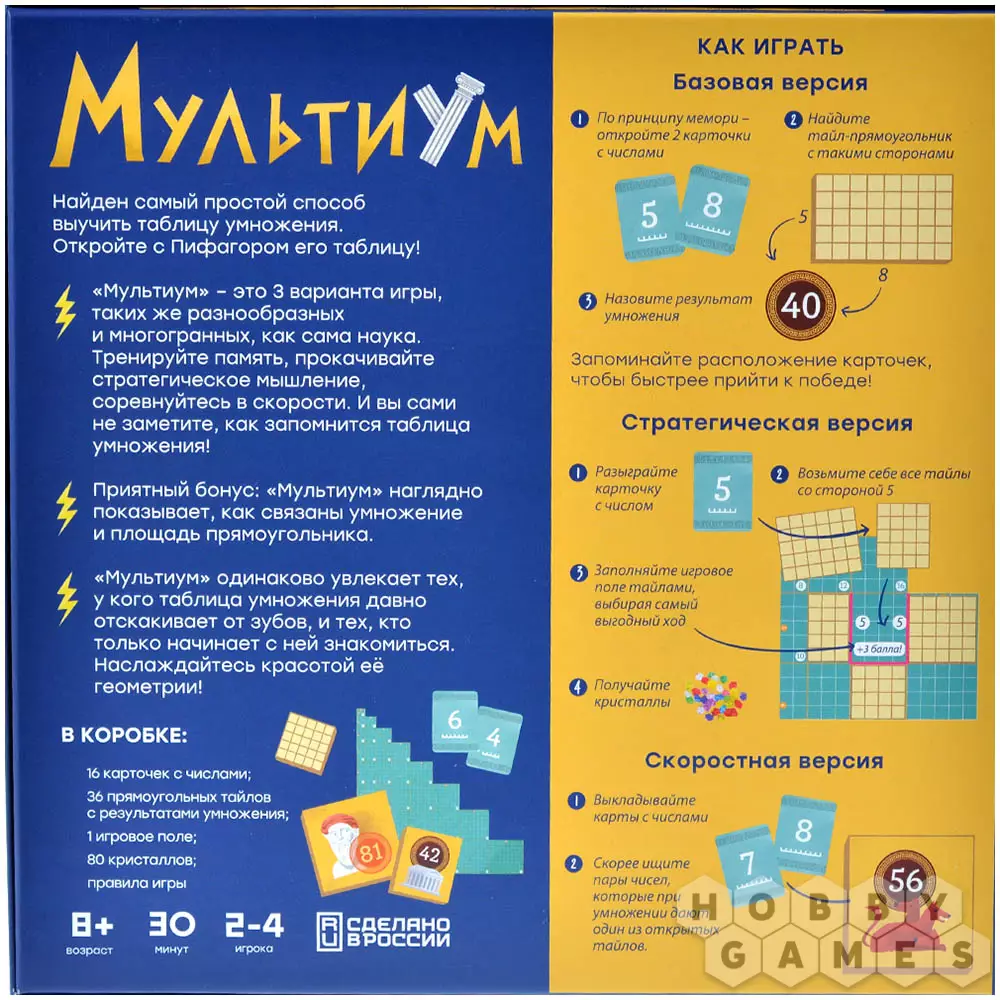 "Мультиум" – это набор сразу из трёх развивающих игр, которые помогают освоить таблицу умножения, знакомят с площадью треугольника и объясняют, как связаны друг с другом эти две вещи. Увлекательный процесс в совокупности с простыми правилами и привлекательными компонентами помогут юным игрокам с лёгкостью освоить математические основы.