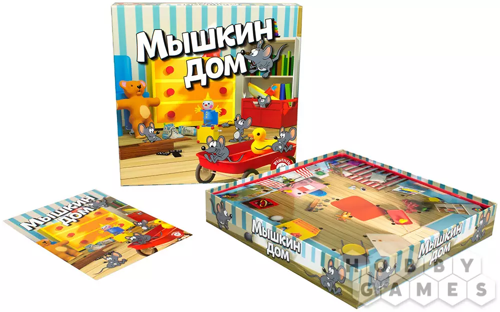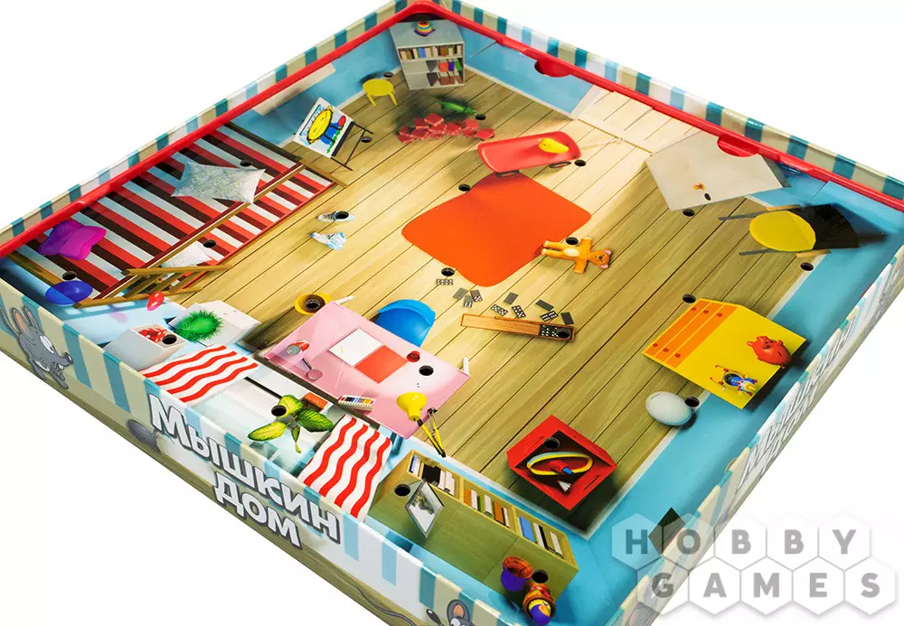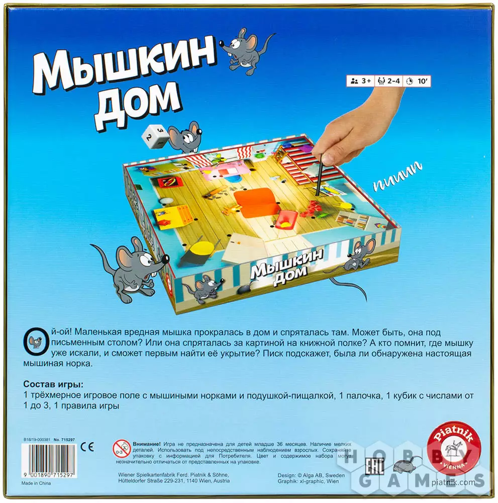 Перед началом игры спрячьте под игровым полем подушку-пищалку и встряхните коробку, чтобы никто не знал, где именно находится наша "мышка". Далее игроки по очереди кидают кубик. Выпавшее число от 1 до 3 означает, сколько у игрока есть попыток, чтобы найти мышку. Для этого нужно вставить специальную палочку в одну из "норок" дома и нажать. Если после этого не раздастся писк, значит, мышка находится в другой норке.