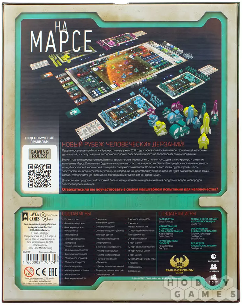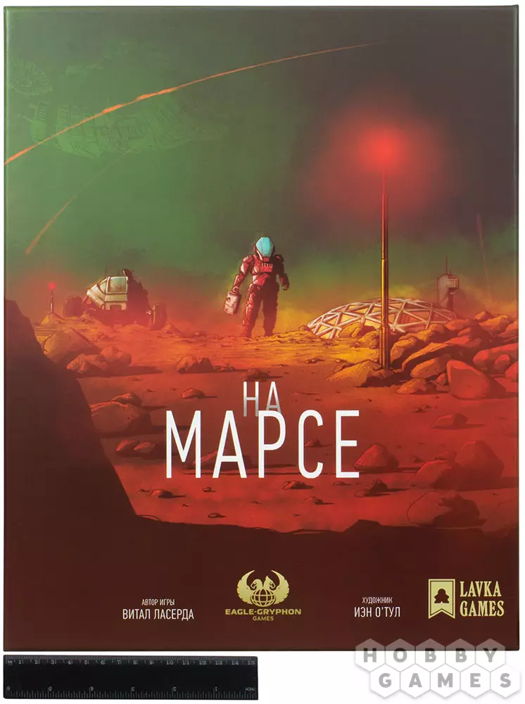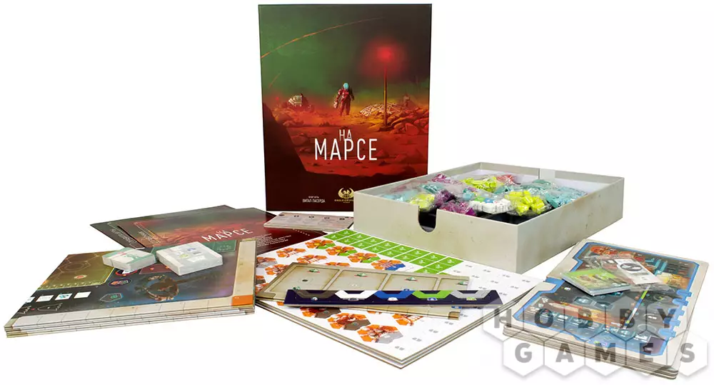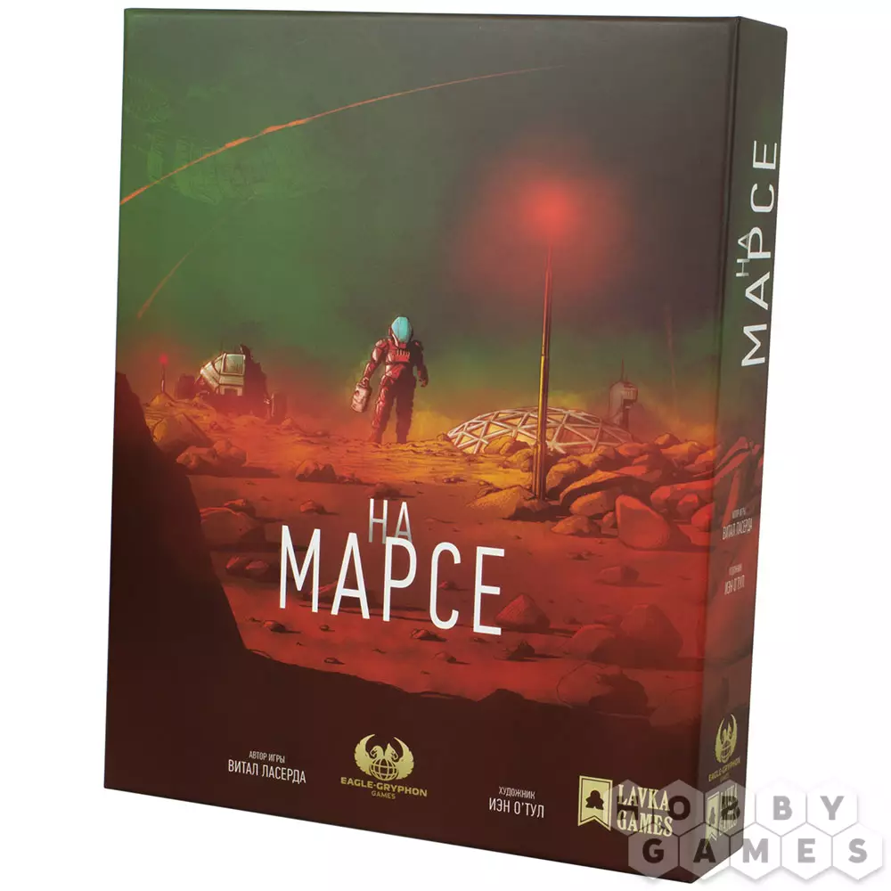 "На Марсе" разработана геймдизайнером Виталом Ласердой, который знаменит своим умением создавать сложные и хорошо сочетающиеся игровые механики. Предыдущие игры Ласерды – это посвящённая виноделию элегантная Vinhos, погружающая в автопром Kanban: Driver's Edition и The Gallerist, знакомящая игроков с миром искусства и коллекционирования. "На Марсе" была номинирована на премию The Laurels: Best Architect Games Of 2019 от The Cardboard Republic и уже заслужила горячую любовь и признание поклонников хардкорных стратегий. Это непростое испытание способности выбирать оптимальный вариант, в котором тактика тесно переплетена со стратегией. Широкий спектр возможностей хода позволяет гибко реагировать на изменение игровой ситуации – но главное понять, какая тактика приведёт вас к победе и титулу лучшего колониста. Такое обилие переменных делает игру очень вариативной – и, соответственно, реиграбельной. Каждая новая партия будет уникальной и заставит вас ломать голову снова и снова. Игра рассчитана на компанию до 4 человек включительно. Также есть соло-режим, в котором вам придётся играть против самого Ласерды – вы будете выполнять действия за него, ориентируясь на специальную колоду карт и правила одиночной игры. Выполняйте тайные и явные цели, стройте здания для добычи необходимых ресурсов и идите к победе!