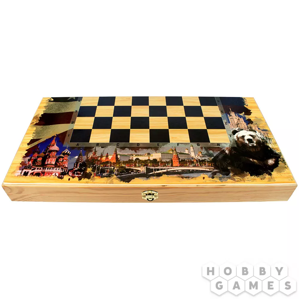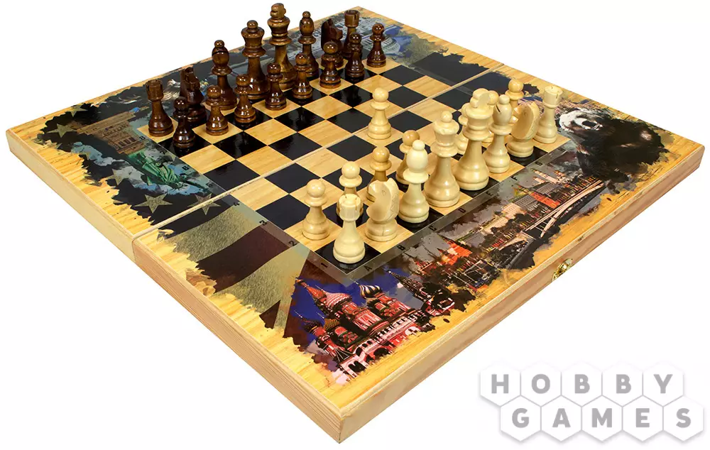 Доска и фигуры шахмат "Россия и Америка" сделаны из берёзы и хвойных сортов древесины.