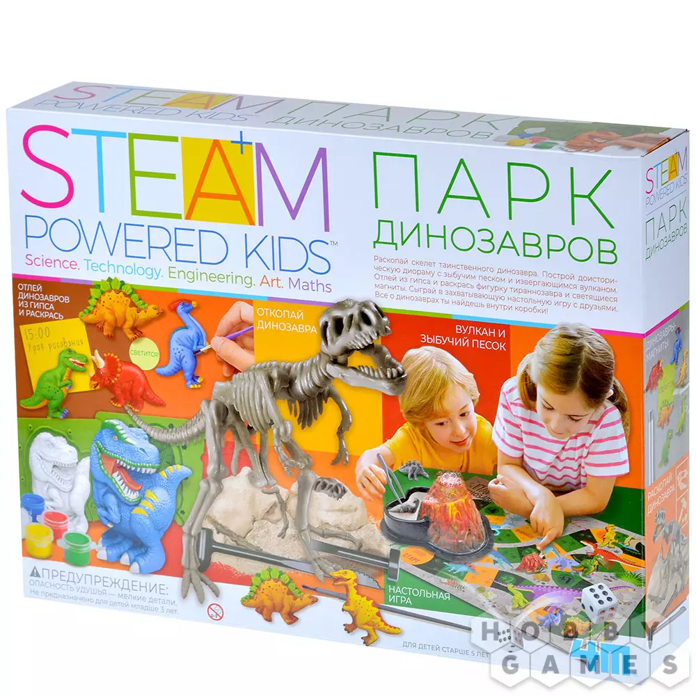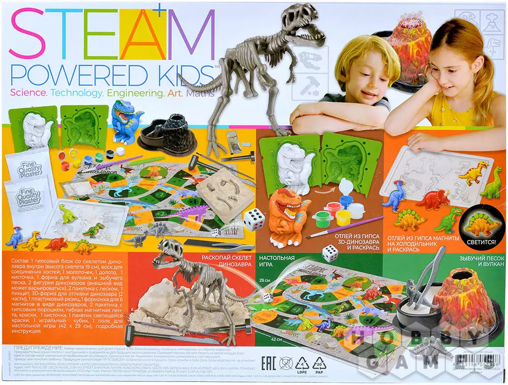 Набор предлагает массу развлечений: можно заняться раскопками и собрать скелет динозавра или отлить цельную модель из гипса. А теперь самое захватывающее – в набор включена увлекательная настольная игра, где можно представить себя настоящим исследователем и управлять гигантским парком динозавров. И это еще не всё! В наборе вас ждёт настоящий вулкан, который вот-вот начнёт извержение! Приготовьтесь к настоящему приключению и погрузитесь в атмосферу древнего мира динозавров!