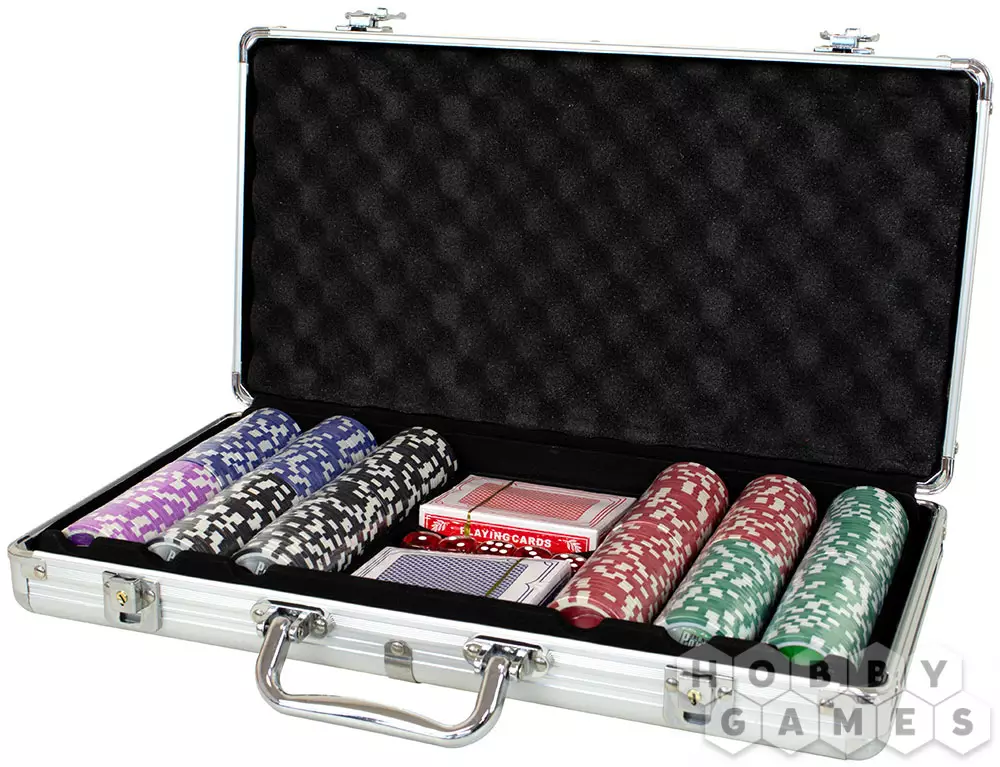 В данном комплекте вы найдёте всё необходимое для игры в классический покер. Внутри вы найдёте 300 стандартных фишек для профессиональной игры (11,5 гр.), фишку дилера, 2 колоды игральных карт, соответствующих качеству карт казино, а также 5 игральных костей. Все компоненты убраны в элегантный и прочный алюминиевый кейс.