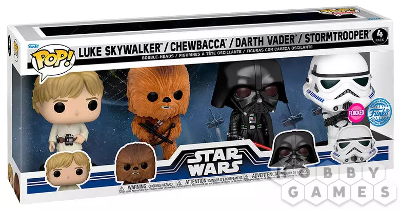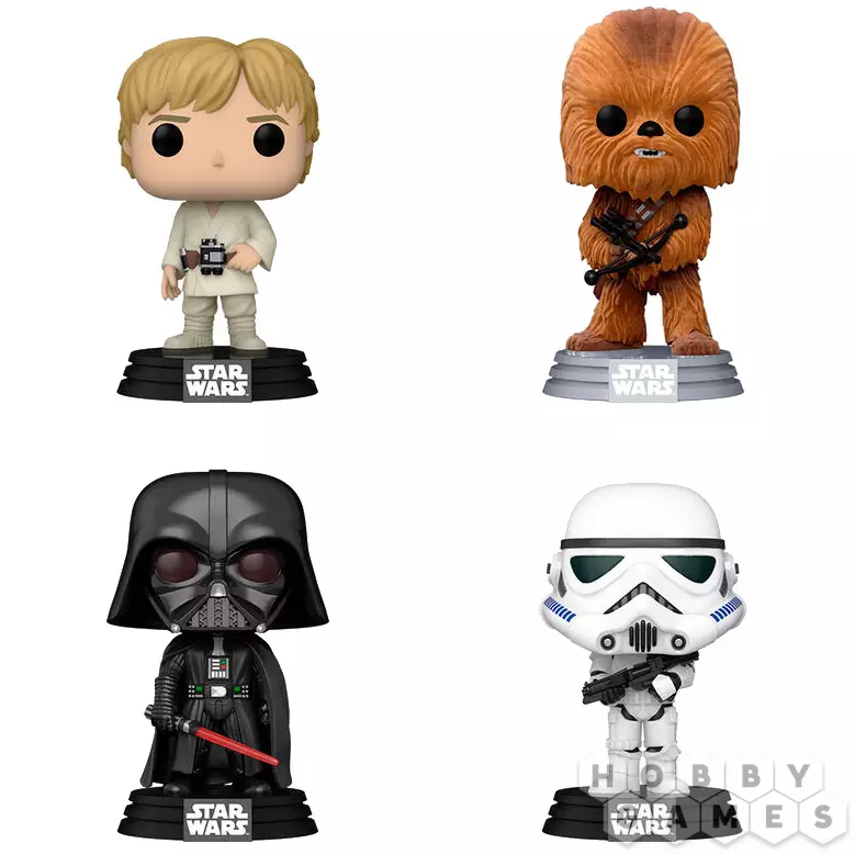 Перед вами набор фигурок Funko POP! Звёздные войны: Люк Скайуокер, Чубакка, Дарт Вейдер, Штурмовик.