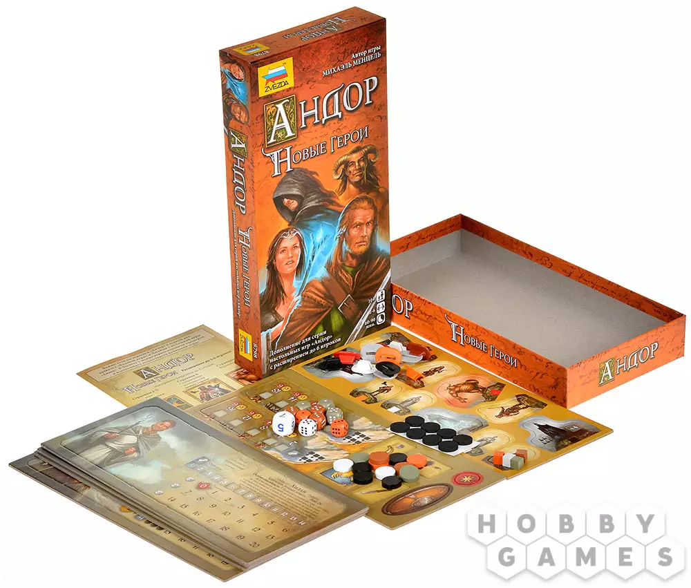 Дополнение "Андор: Новые Герои" расширит количество персонажей базовой игры ещё на четырёх, каждый из которых – уникальный персонаж со своими способностями, предметами, сильными и слабыми сторонами. На защиту Андора становятся следопыт Фенн со своим ручным вороном, хранитель речных земель Кила, рогатый Брагор, вооружённый копьём, сильный как в ближнем бою, так и на дистанции, и хранитель чёрного архива Арбон. Кроме новых героев, в коробке вы найдёте могущественный артефакт – Братский щит. Дополнение позволяет играть в базовую игру вшестером.