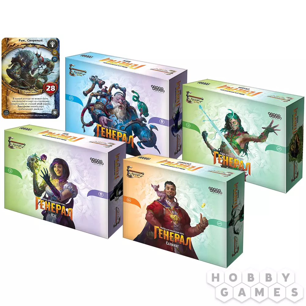 В этом наборе вас ждут: "Берсерк. Герои. Генерал: Корб", "Берсерк. Герои. Генерал: Кэт", "Берсерк. Герои. Генерал: Сахана" и "Берсерк. Герои. Генерал: Саламат". Но это не всё! В подарок вы также получите промокарту Рыка. Иначе говоря, 5 источников серотонина и дофамина, знакомых каждому игроку, который хоть раз покупал какую-нибудь новенькую настолку.