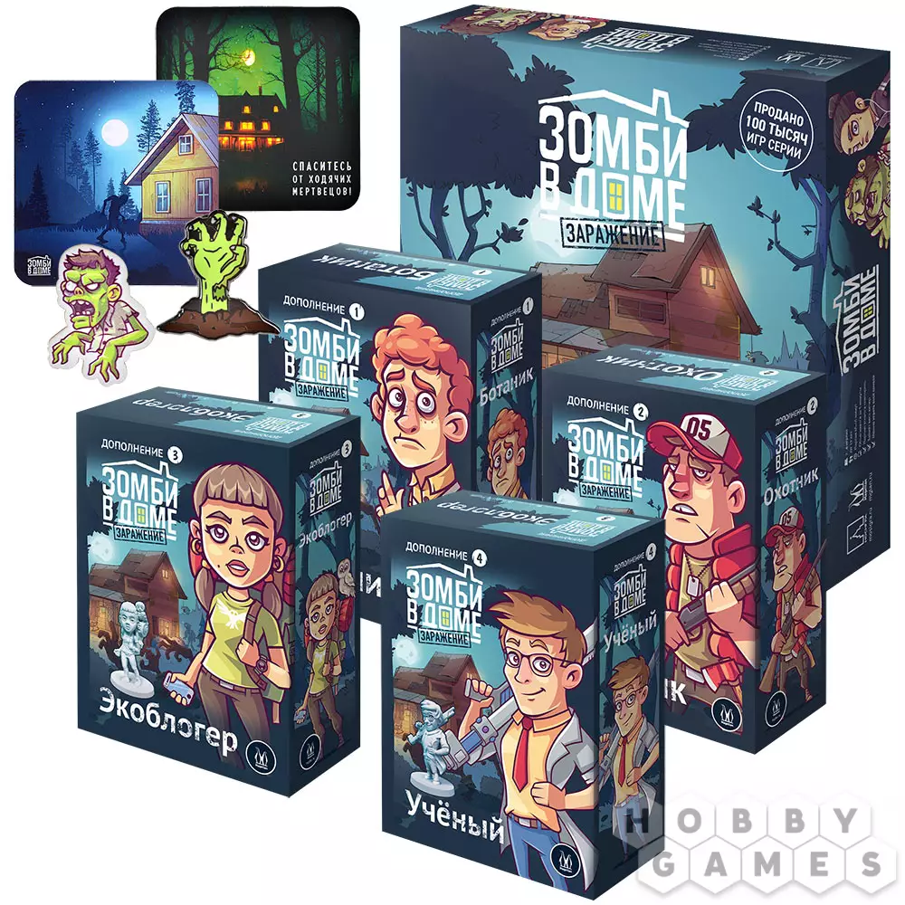 Стандартная завязка: заброшенная хижина в глухом лесу, в котором вы застряли. Уже понятно, что к чему, не так ли? Стоило бы пройти мимо, но вы с друзьями зашли осмотреться – и теперь так просто отсюда не выйдете, ведь вас окружили голодные зомби. Спасение утопающих – дело рук самих утопающих, так что хватайте топор и крошите злобных мертвецов на мелкие кусочки. Набор "Ходячие мертвецы" включает в себя базовую игру "Зомби в доме: Заражение", 4 дополнения к ней: "Зомби в доме: Заражение. Ботаник", "Зомби в доме: Заражение. Охотник", "Зомби в доме: Заражение. Экоблогер" и "Зомби в доме: Заражение. Учёный", а также 2 костера и 2 значка (металлический и деревянный) – и всё это со скидкой 15%!