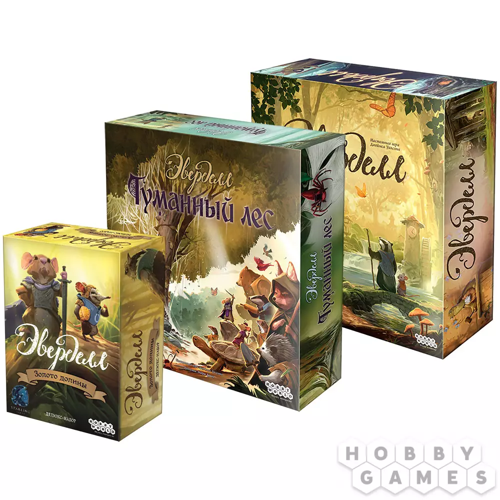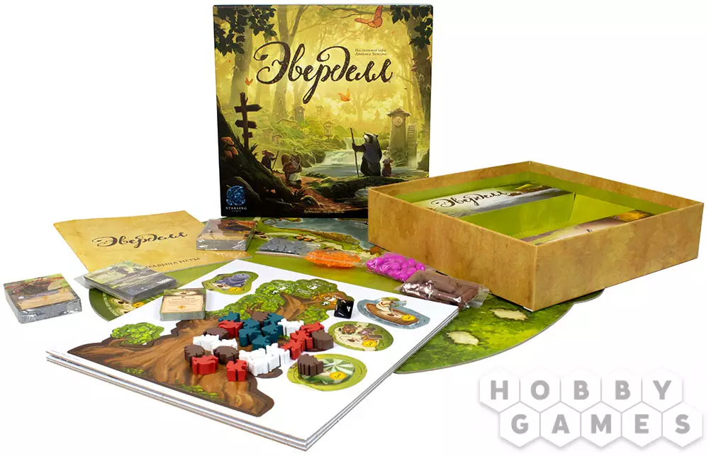 "Эверделл" – это волшебная настольная игра для 1-4 игроков и само воплощение тепла и уюта. Действие игры происходит в сказочном мире, где животные разговаривают и дружно живут вместе в лесных городах. Прежде всего, игра удивит вас своим очаровательным дизайном игрового поля и компонентов, в которых используются мягкие и приятные цвета. Во главе игрового поля стоит настоящее дерево, которое нужно будет собрать по инструкции из картонных элементов. Дерево не просто выполняет декоративную функцию – на его ветвях располагаются карты и фигурки.