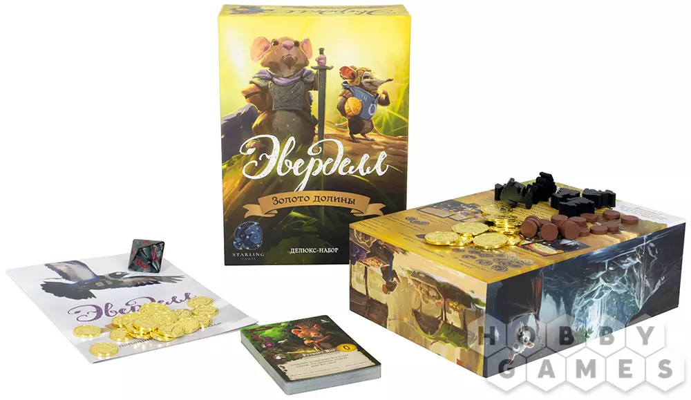 Внутри делюкс-набора "Золото долины" вы найдёте монеты, 6 чёрных работников-крыс, кубик для соло-игры и три мини-дополнения: