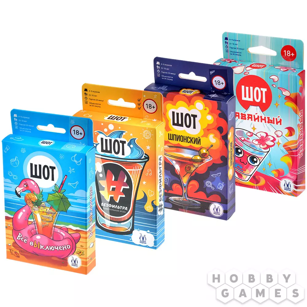 Шот – это веселая игра для вечеринки для любителей выпить на тему отпуска на море. Правила очень простые: либо выполняете задания с карточки, либо пьёте, если задание не понравилось. Игра заканчивается, когда из колоды будет вытянута карта "Пора домой".