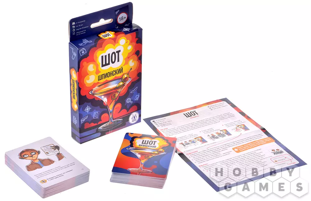 "Шот Шпионский" – это карточная настольная игра с заданиями, в которую обязательно нужно играть с бокальчиком чего-нибудь крепкого. Вообще, с шотом, если отталкиваться от названия игры, но кто ж знает ваши объёмы?! Правила очень простые и объясняются буквально за считанные секунды: в свой ход вы либо выполняете задание, либо пьёте. Других действий нет! Вернее, действий в игре полным-полно, а надо оно вам или нет, решайте сами. Игра идёт до тех пор, пока из колоды не будет вытащена карта "Миссия выполнена", а победу одерживает самый успешный шпион, выполнивший больше всех миссий (для этого всё же придётся подвигаться).