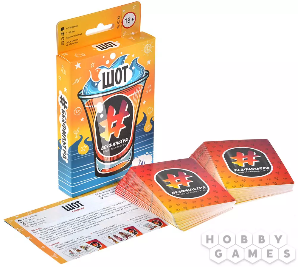 "Шот #безфильтра" – высокоградусное развлечение для весёлой компании. Это игра про близость, откровенность и треш в соцсетях. Иногда вы будете просто дурачиться, а иногда придётся постить на всеобщее обозрение в соцсетях нечто странное, так что морально приготовьтесь. В свой ход участники будут брать из колоды карточки заданий. Прочитав, игрок решает, выполнить задание, или пропустить его. В этом случае придётся выпить "штрафную" и передать карту дальше. Наверняка не каждому под силу будет устроить показ своего нижнего белья или же громко прокричать в открытое окно то, что придумает сидящий напротив игрок! За каждое выполненное задание начисляется по одному победному очку.