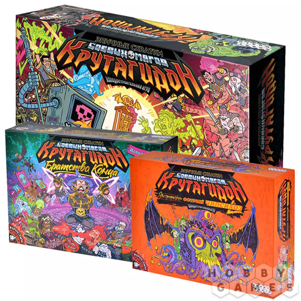 Набор включает в себя игру "Эпичные схватки боевых магов: Крутагидон", дополнение "Эпичные схватки боевых магов: Крутагидон. Братство конца" и дополнение "Эпичные схватки боевых магов: Крутагидон. Экстремально острый чипсихоз" со скидкой 15%.