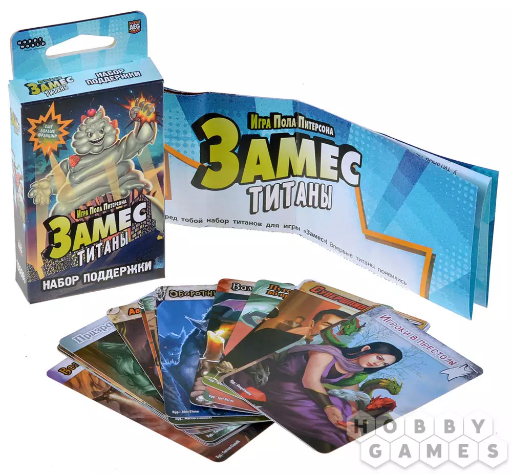 Данный набор содержит карты титанов для 16 колод из разных наборов "Замеса". Сами по себе титаны принципиально отличаются от любых других карт в игре. В начале игры титаны лежат рядом со своими владельцами на столе – при этом они не могут попасть ни в руку, ни в колоду, ни в стопку сброса. Они для такого слишком круты. Когда свойство какой-либо карты (включая самого титана!) позволяет вам разыграть титана, вы можете сделать это –- либо проигнорировать возможность, чтобы приберечь козырь.