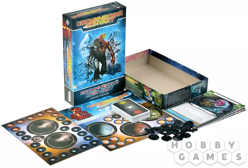 "Космический конфликт" – это очередное дополнение для настольной игры "Космический контакт". Как и все предыдущие дополнения, оно делает космическое пространство ещё более бескрайним! Сразу 20 неизвестных до нынешнего момента рас присоединятся к гонке за межгалактическое превосходство: раса Эмпатов выглядит достаточно безобидно, но первое впечатление всегда обманчиво; представители расы Безумцев названы безумцами непросто так – вы точно не будете знать, чего ожидать от их выходок. Помимо новых рас, в "Космическом конфликте" вы найдёте компоненты для шестого игрока (а добавив в игру ещё и дополнение "Космическое вторжение", состав участников партии можно расширить до 7 человек)! А колода карт угроз вносит особые опасности и эффекты в случае раскрытия карты судьбы. Отныне сражения в бескрайнем космосе приобретают более непредсказуемый характер!
