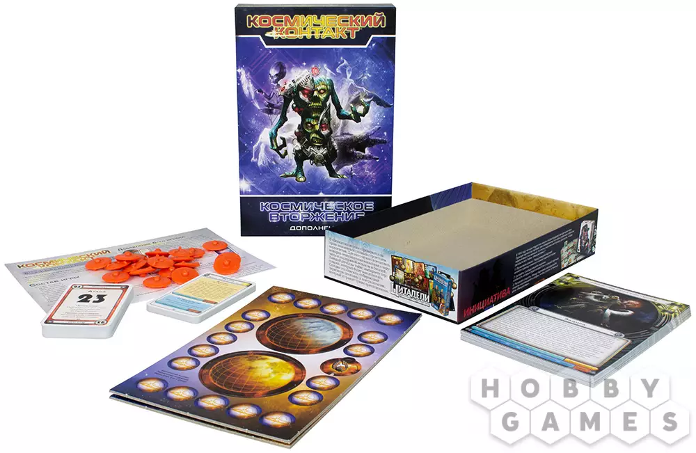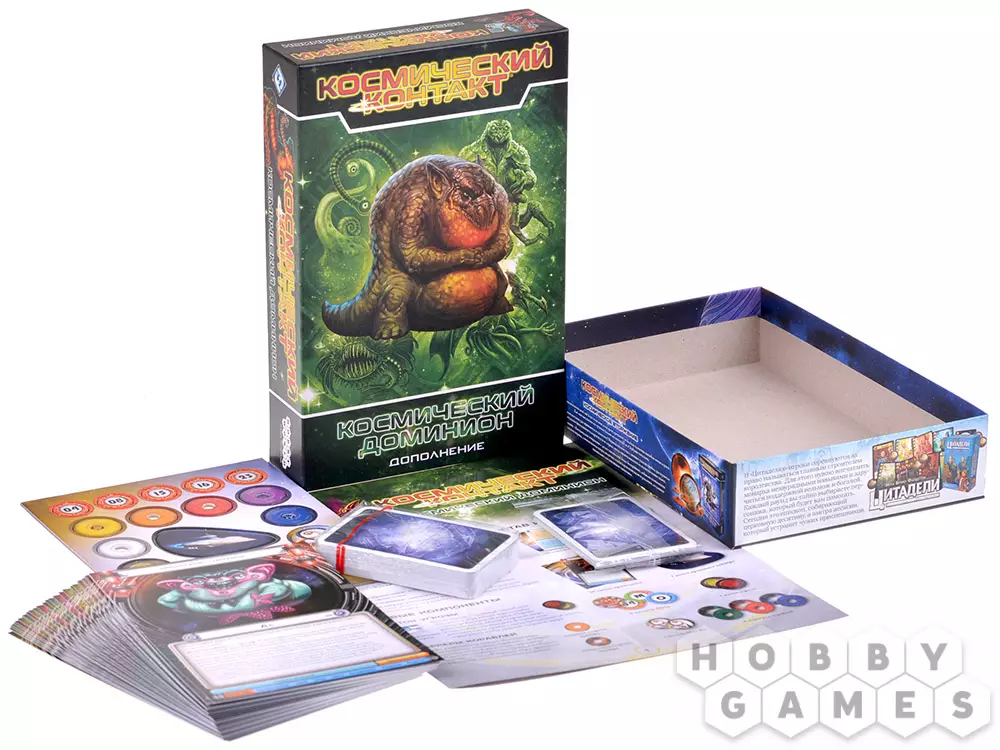 Космический доминион" добавляет в "Космический контакт" ещё больше разнообразия за счёт 30 новых рас. Вы только вдумайтесь: 30 рас! Вариативность и реиграбельность взлетает до небес. Безусловно это ещё не всё – в коробке вас ждёт новая колода наград, которая включает в себя карты атаки с переменным значением, карты отступления и карты устрашения. А ещё маркеры космических кораблей, с помощью которых вы сможете не только сыграть в новые режимы, но даже придумать свой собственный! Но самое примечательно в "Космическом доминионе" то, что в основу его разработки легли идеи фанатов "Космического контакта". Так что, если вам понравилась базовая игра, контент из этого дополнения точно придётся вам по душе.