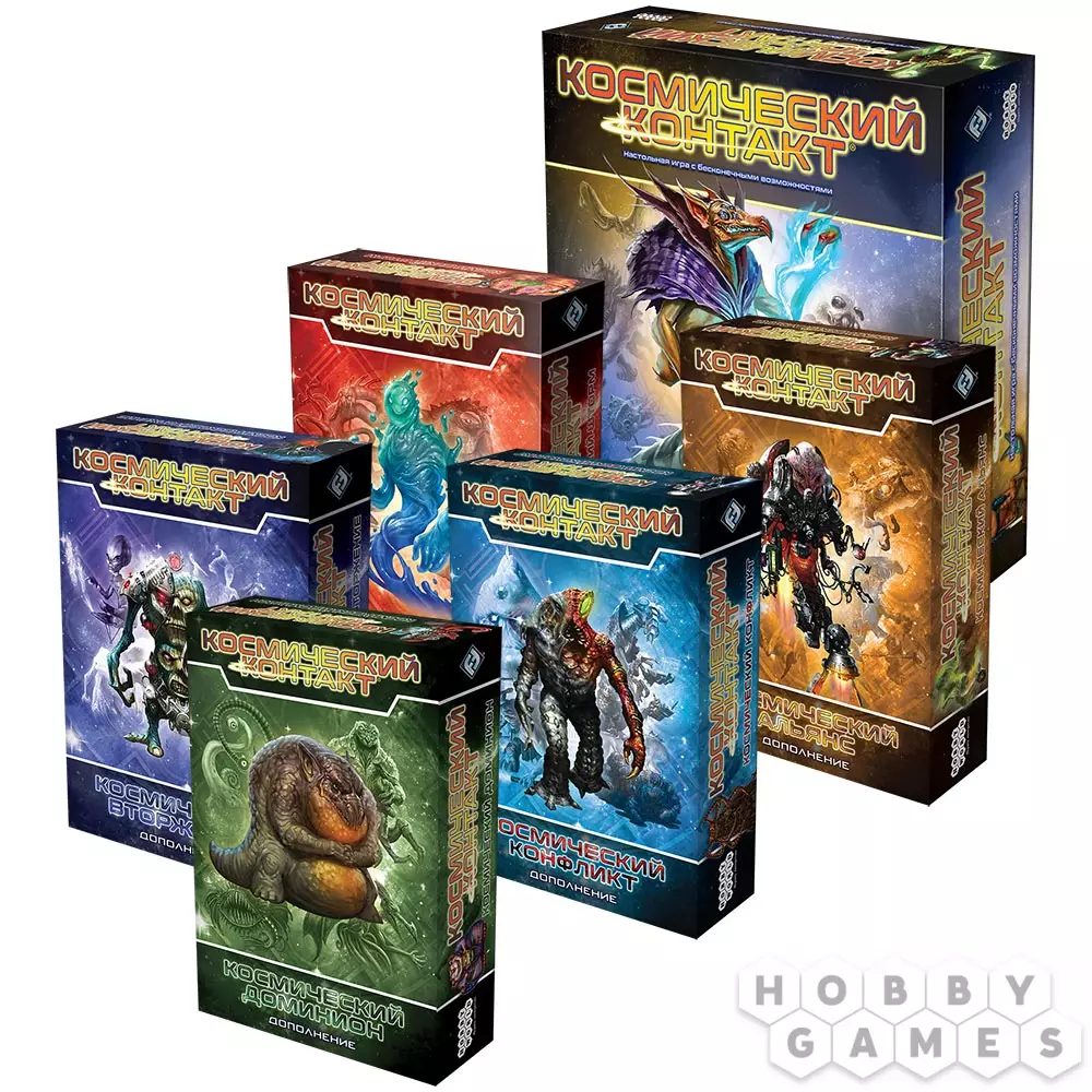 Набор включает в себя игру "Космический контакт"и 5 дополнений: "Космический контакт: Космическое вторжение", "Космический контакт: Космический конфликт", "Космический контакт: Космический доминион", "Космический контакт: Космический альянс" и "Космический контакт: Космический шторм" со скидкой 15%.