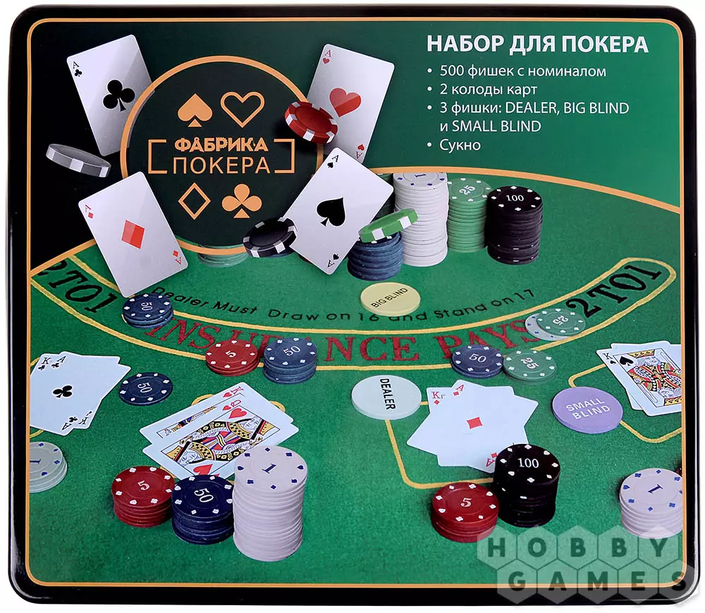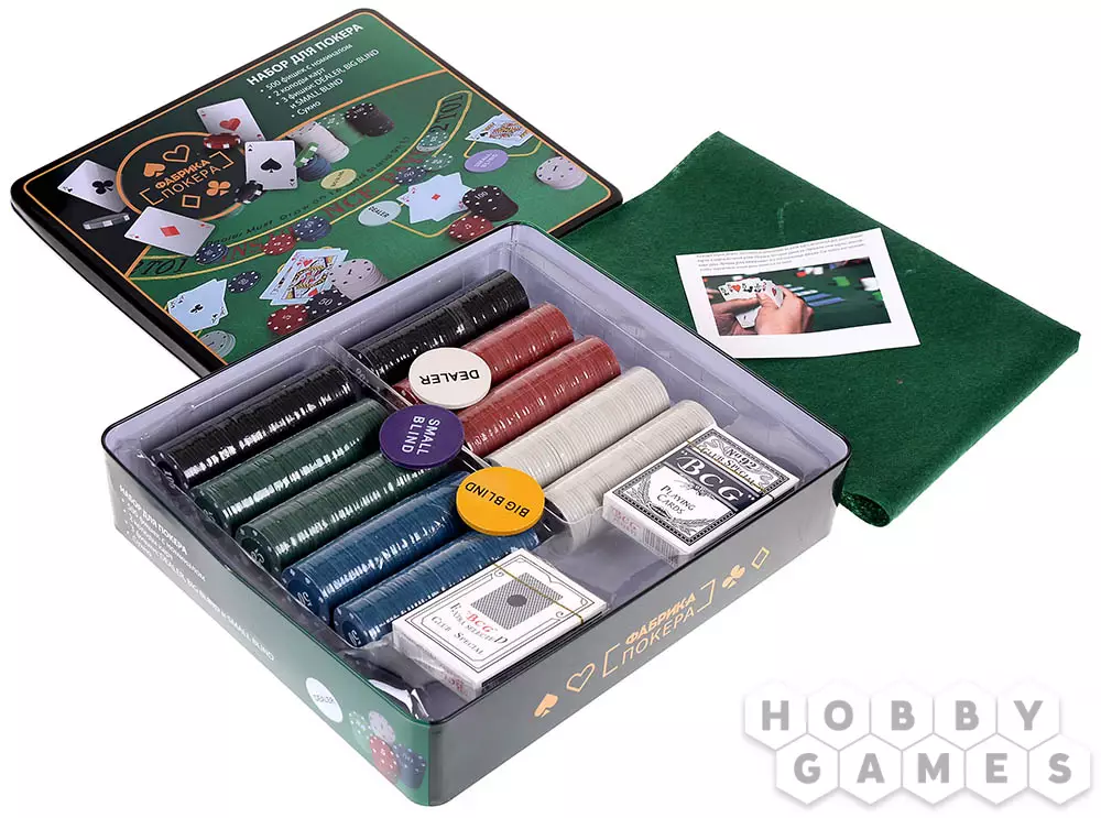 В данном комплекте вы найдёте всё необходимое для игры в классический покер. Внутри вы найдёте 500 фишек для игры (3,5 гр.), фишки дилера и блайндов, сукно и 2 колоды игральных карт. Все компоненты убраны в удобную и надёжную жестяную коробку.