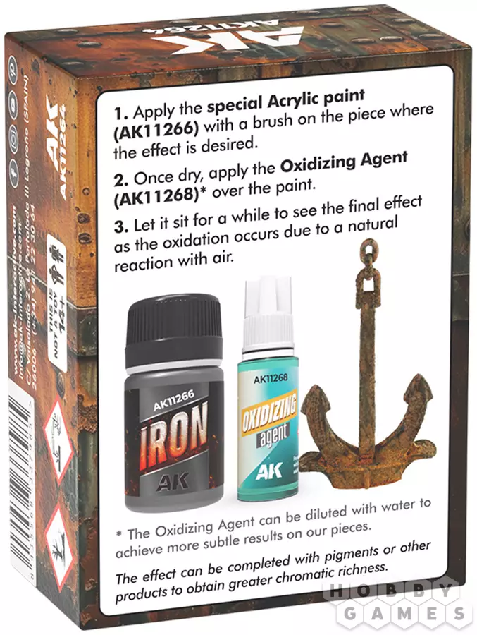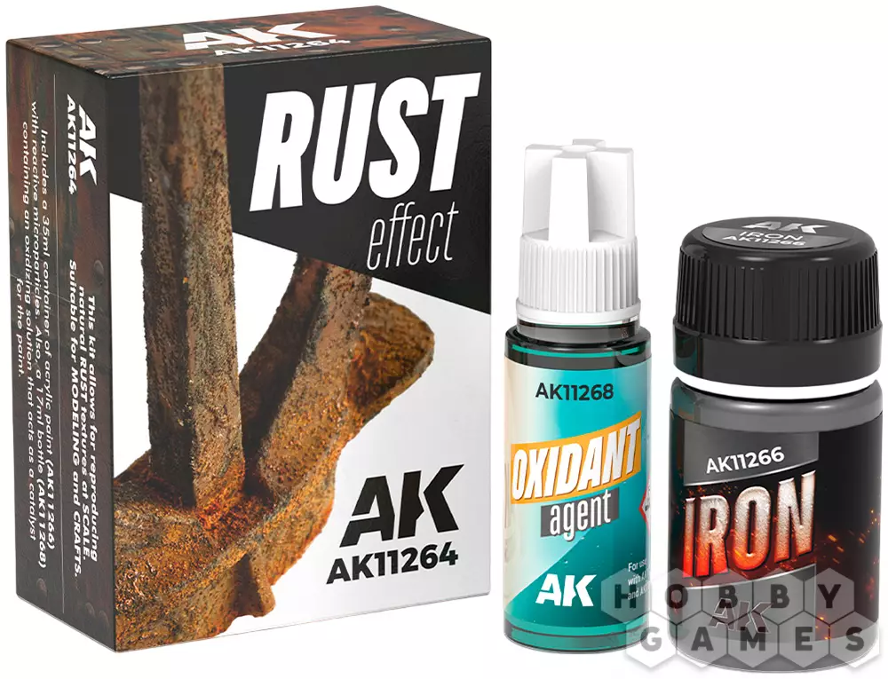 С помощью этого набора вы сможете создать высокореалистичные эффекты ржавчины на моделях и миниатюрах. Для этого нужно совсем немного: всего лишь нанести на необходимый участок специальную акриловую краску, а затем, после её высыхания, добавить сверху окислитель. После этого дайте составу некоторое время для реакции – окончательный эффект проявится благодаря естественному окислению при контакте с воздухом. Если требуется менее яркий результат, просто разбавьте окислитель водой. Эффект можно дополнить пигментами или другими продуктами для достижения большей цветовой насыщенности.