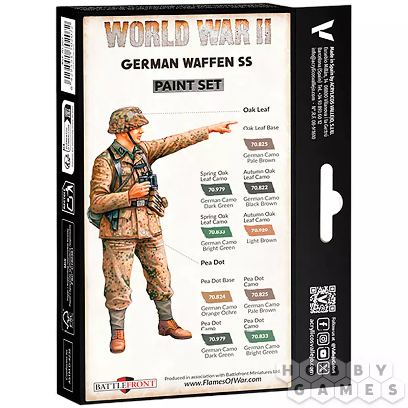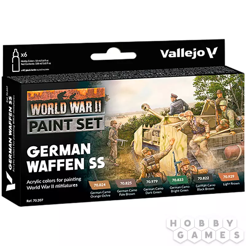Этот набор красок, в сочетании с универсальным комплектом, предоставляет все нужные оттенки для детальной покраски униформы немецких войск СС времён Второй мировой войны.
