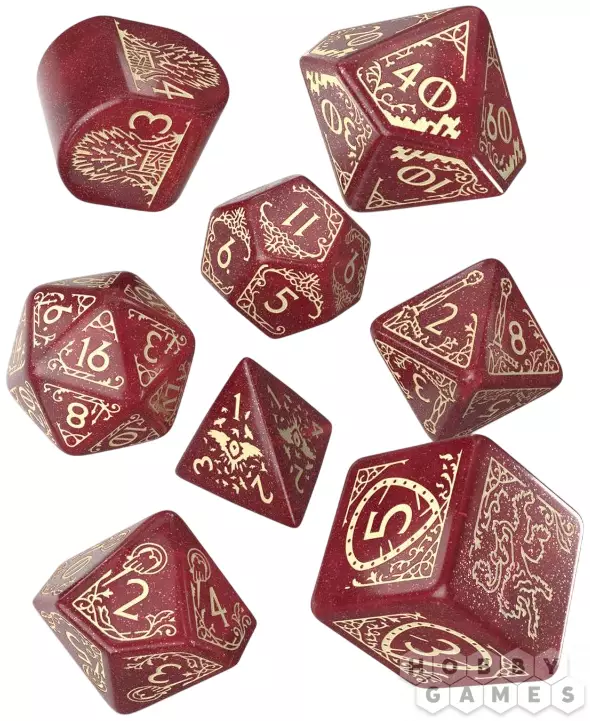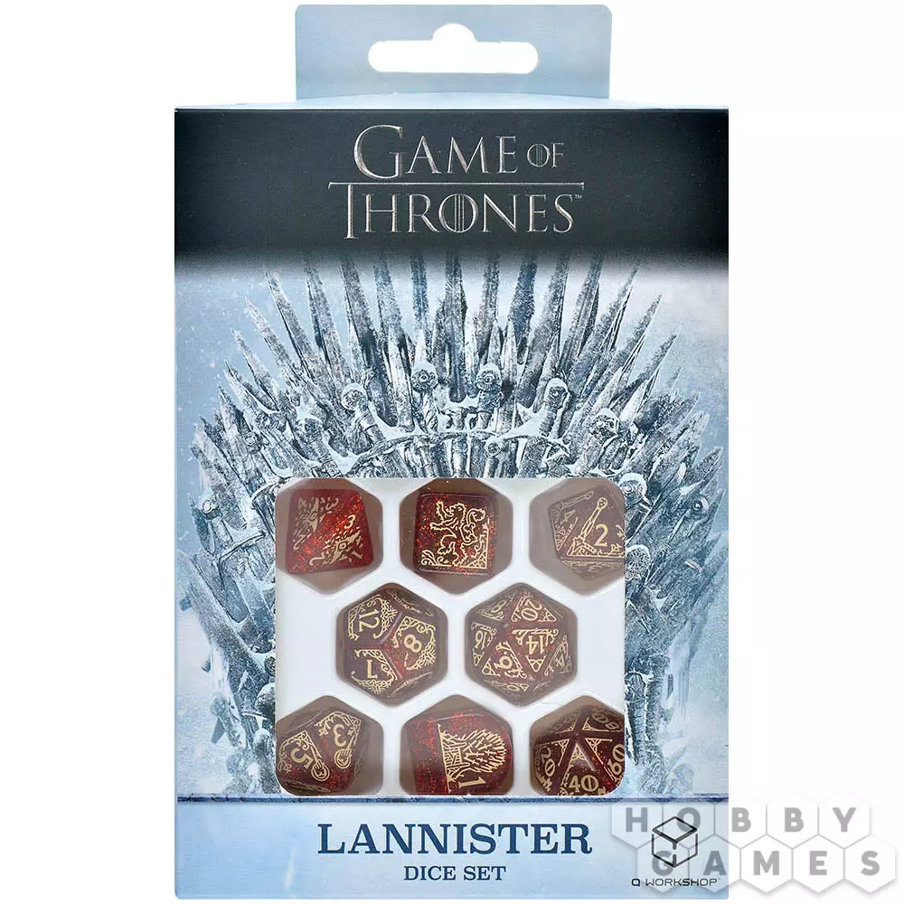 Власть, богатство и неприкрытое величие – этот официальный набор костей воплощает саму суть Дома Ланнистеров. Мерцающие алые грани, отмеченные золотисто-жёлтой гравировкой, словно отлиты из чистого золота и киновари, повторяя цвета их гордого штандарта. Узнаваемые символы дома – гордый лев, брошь Десницы Короля и неприступный Утёс Кастерли – застыли на старших значениях.