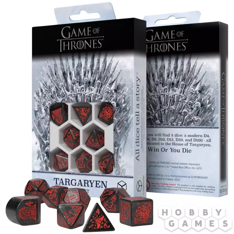 Ощутите жар драконьей крови – огненное наследие Дома Таргариенов оживает в этом наборе игральных костей. Мерцающая чернь граней с кроваво-красной гравировкой повторяет цвета их легендарного знамени. В дизайне отображены очертания драконьих крыльев и языков пламени, а также главный символ дома – трёхглавый дракон. Каждая деталь выверена до мелочей, чтобы вызвать мгновенное узнавание у поклонников саги.