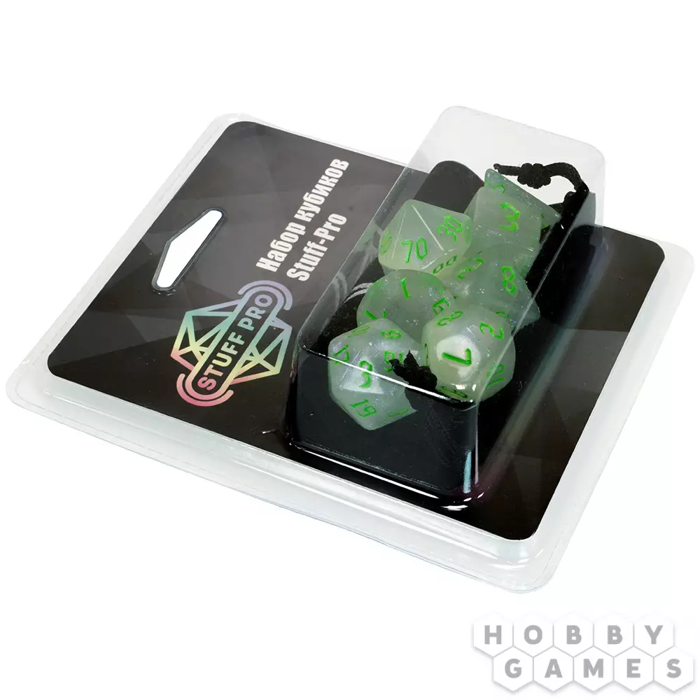 Вопросы про Набор кубиков Stuff-Pro для ролевых игр (жемчужный c зелёными цифрами)