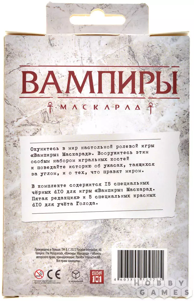 С помощью данного набора кубиков для игры “Вампиры: Маскарад”, ваше погружение в мрачный мир игры станет простым и ненапряжным. В комплекте вас встретят 20 кубиков d10 с оригинальными символами игры от Paradox Interactive, среди которых 15 кубиков чёрного цвета для стандартных проверок навыков и 5 кубиков красного цвета, предназначенных для пула Голода. С ними ваши партии в "Вампиры: Маскарад" станут ещё более атмосферными и желанными.